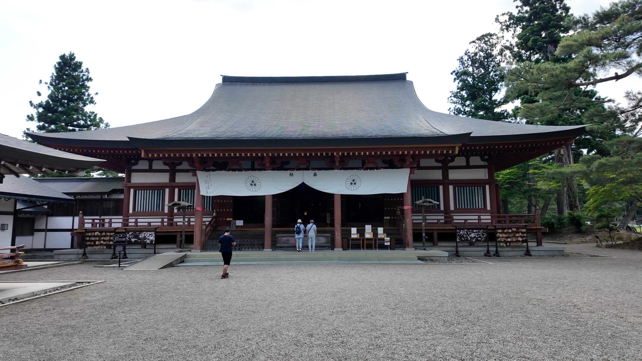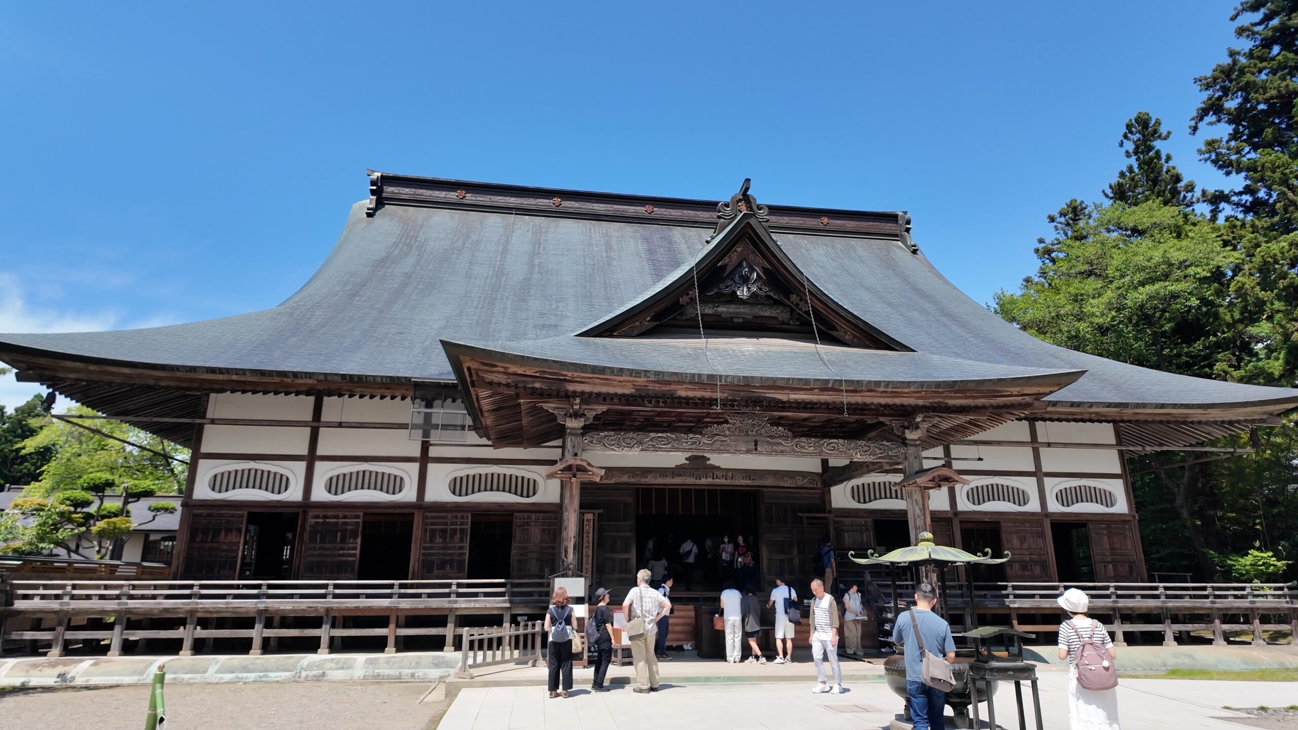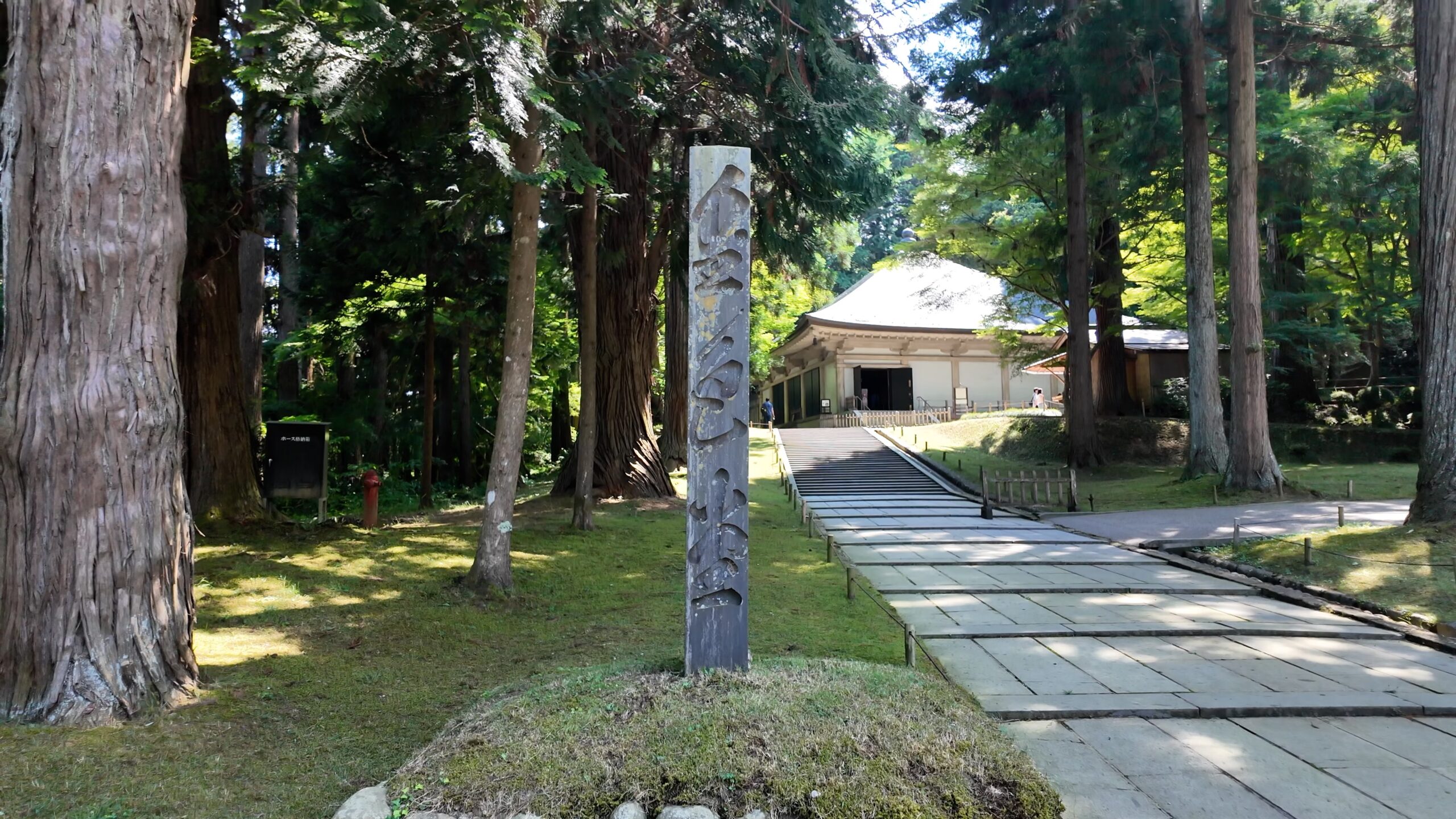 休憩後に歩き始めて、その後にやって来たのが本堂です。現在の中尊寺における信仰と活動の中心地と言える場所です。創建当時(平安時代)の中心は「多宝塔」や「大長寿院」といった別の建物でしたが、それらが焼失したため、明治時代に再建されたこの本堂がその役割を引き継いでいます。建物の外観は勿論ですが、中に入って釈迦如来坐像(しゃかにょらいざぞう)を見学したりして過ごしていました。