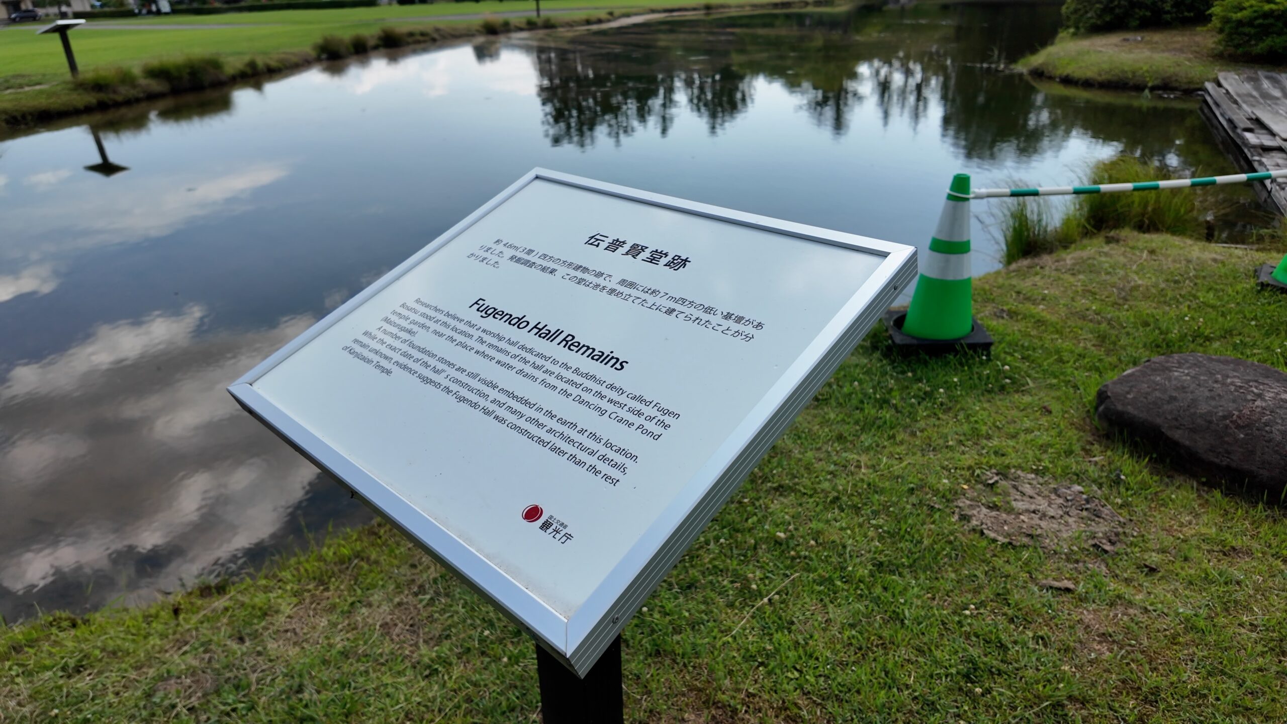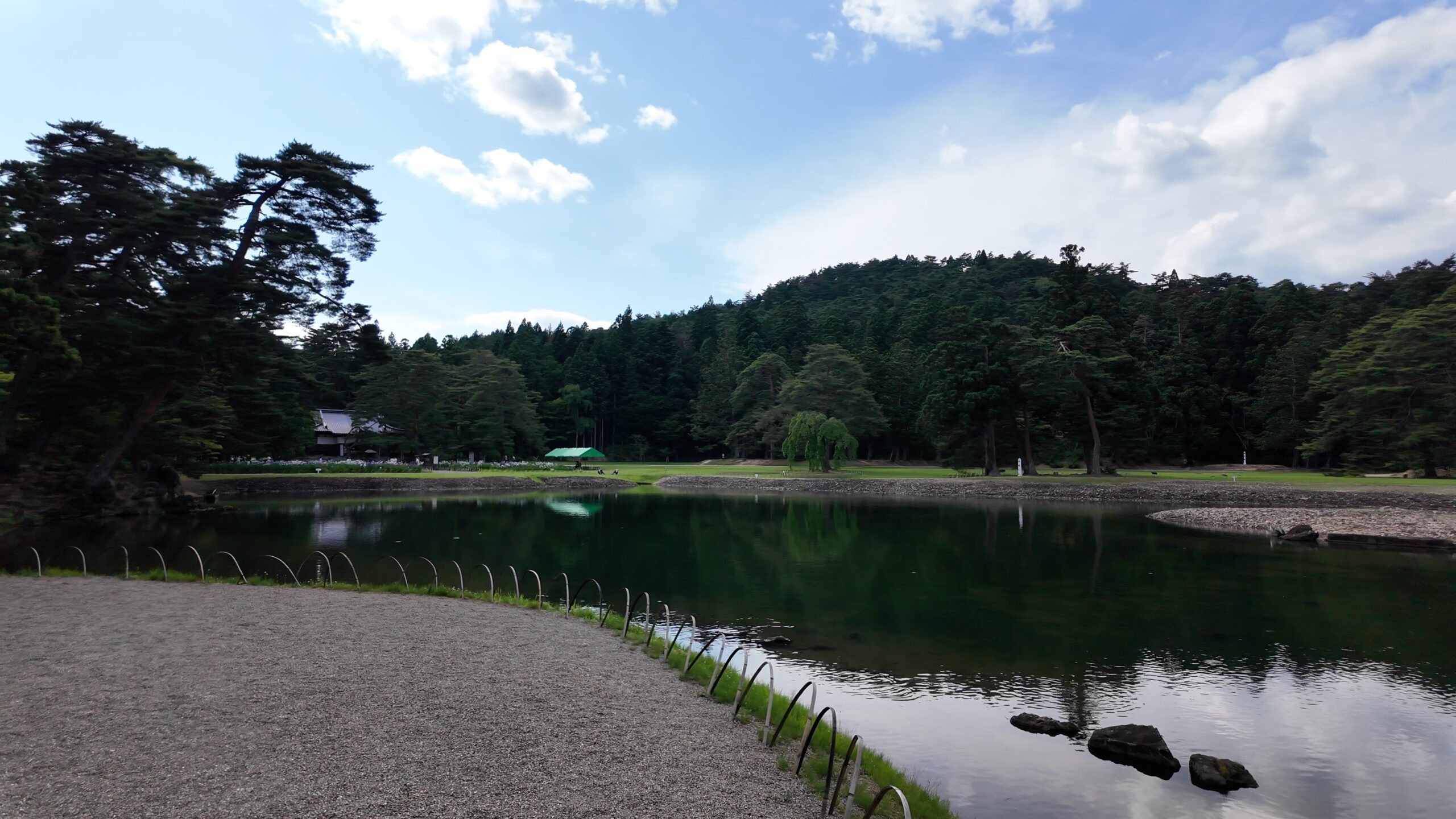 中尊寺の見学を終えて次の目的地に向かいますが、その途中にあるのが平泉の毛越寺(もうつうじ)の浄土庭園内にある「伝普賢堂跡(でんふげんどうあと)」です。毛越寺の美しい大泉が池のほとりにある、かつてお堂が建っていたとされる場所です。現在では建物の礎石(そせき)がいくつか残るのみですが、ここに美しいお堂が建っていたことを想像しながら、目の前に広がる浄土庭園の景色を眺めると、平安時代の雅な雰囲気に思いを馳せることができます。