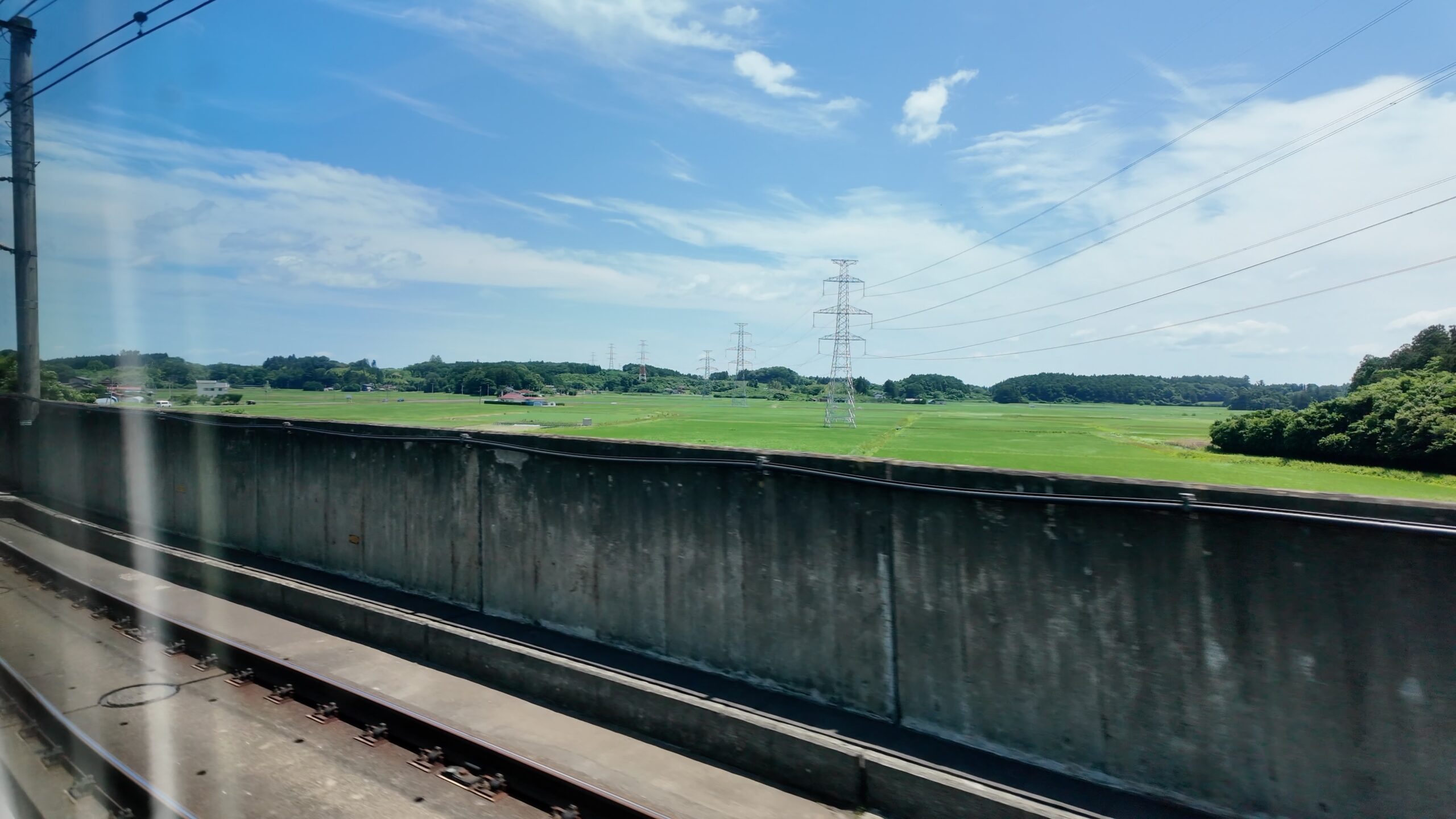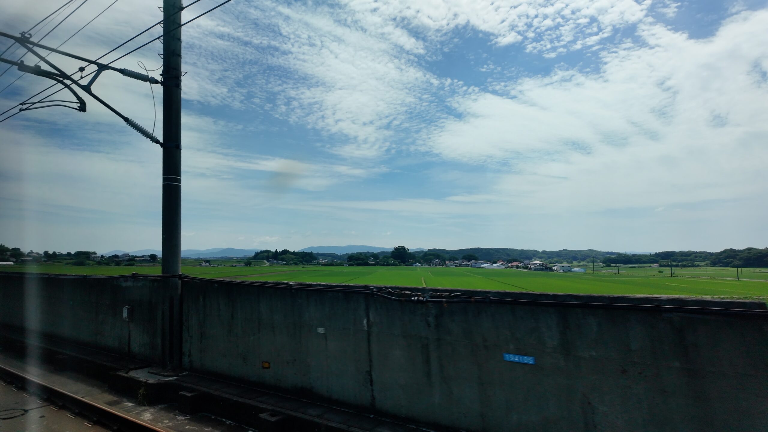 写真は福島駅を通過した時の様子ですが、数秒で駅を通過して行くので、駅名表示を目で追うのも大変なくらいです。はやぶさ号なので大宮の次は仙台に停車となるので、次々とその間の駅を通過して北上します。北上中も天気が変わらず予報通り晴れていました。
