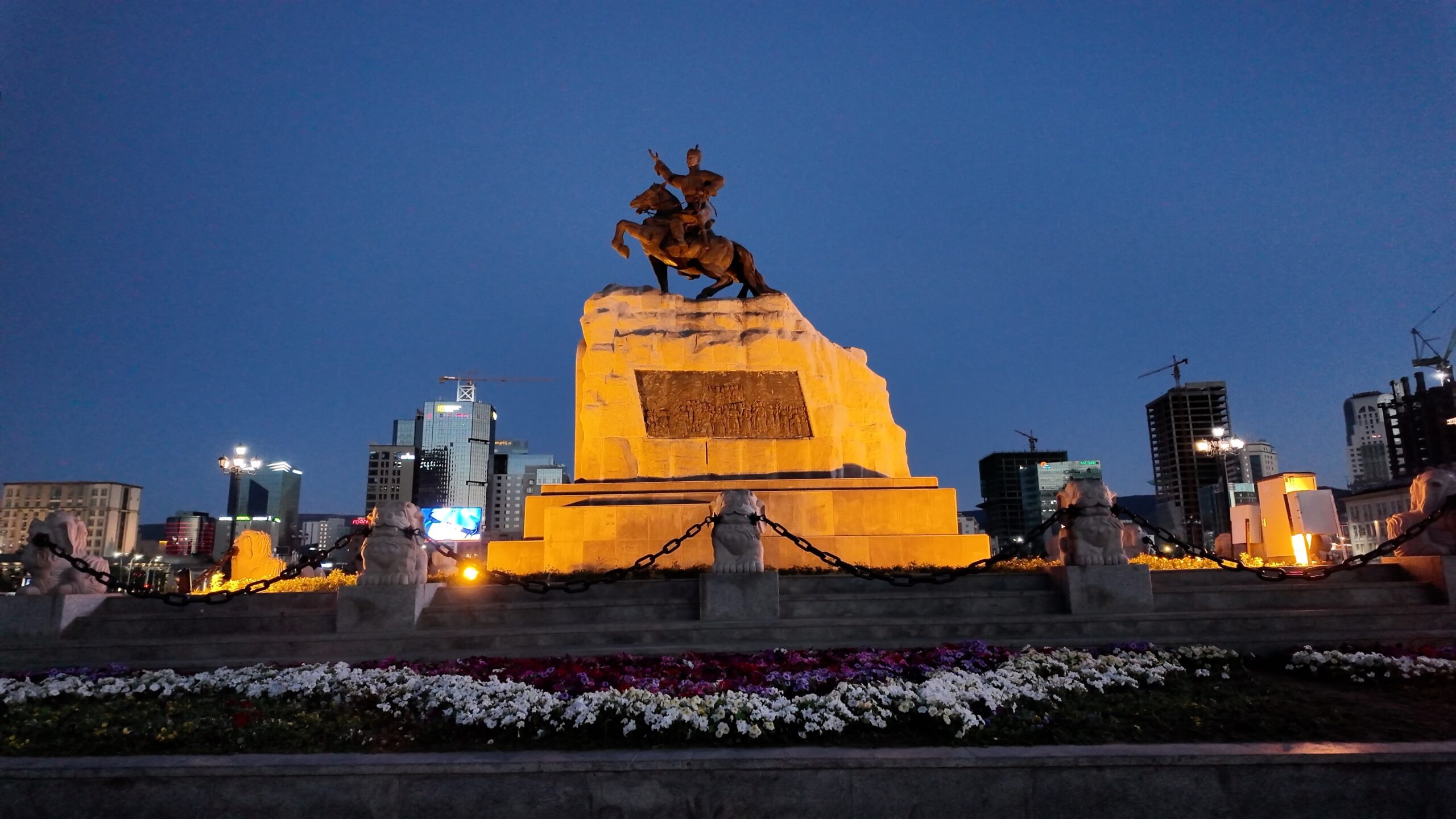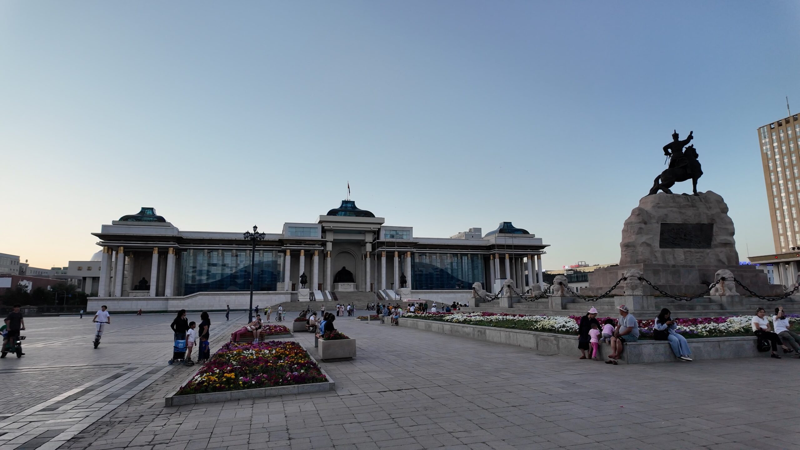 やって来たのは、スフバートル広場です。空港から最初にこちらに来て観光が始まったので、旅の締めもここかなと言うのと、恐らく夜景も綺麗なのではと思ったのでやって来ました。既に夜の8時半を過ぎていましたが、日が落ちるまではもう少しかかりそうです。待っている間に調べてみると、この日は、日の出:午前 5時14分(5:14 AM)、日の入り:午後 8時42分(8:42 PM)で、日の出から日の入りまでの日中時間は約 15時間28分との事でした。現地に来るまでこんなに日中の時間が長いとは知りませんでしたが、涼しくなって来たのもあり、日が落ちてくると広場に人が少しずつ増えてくるような感じでした。