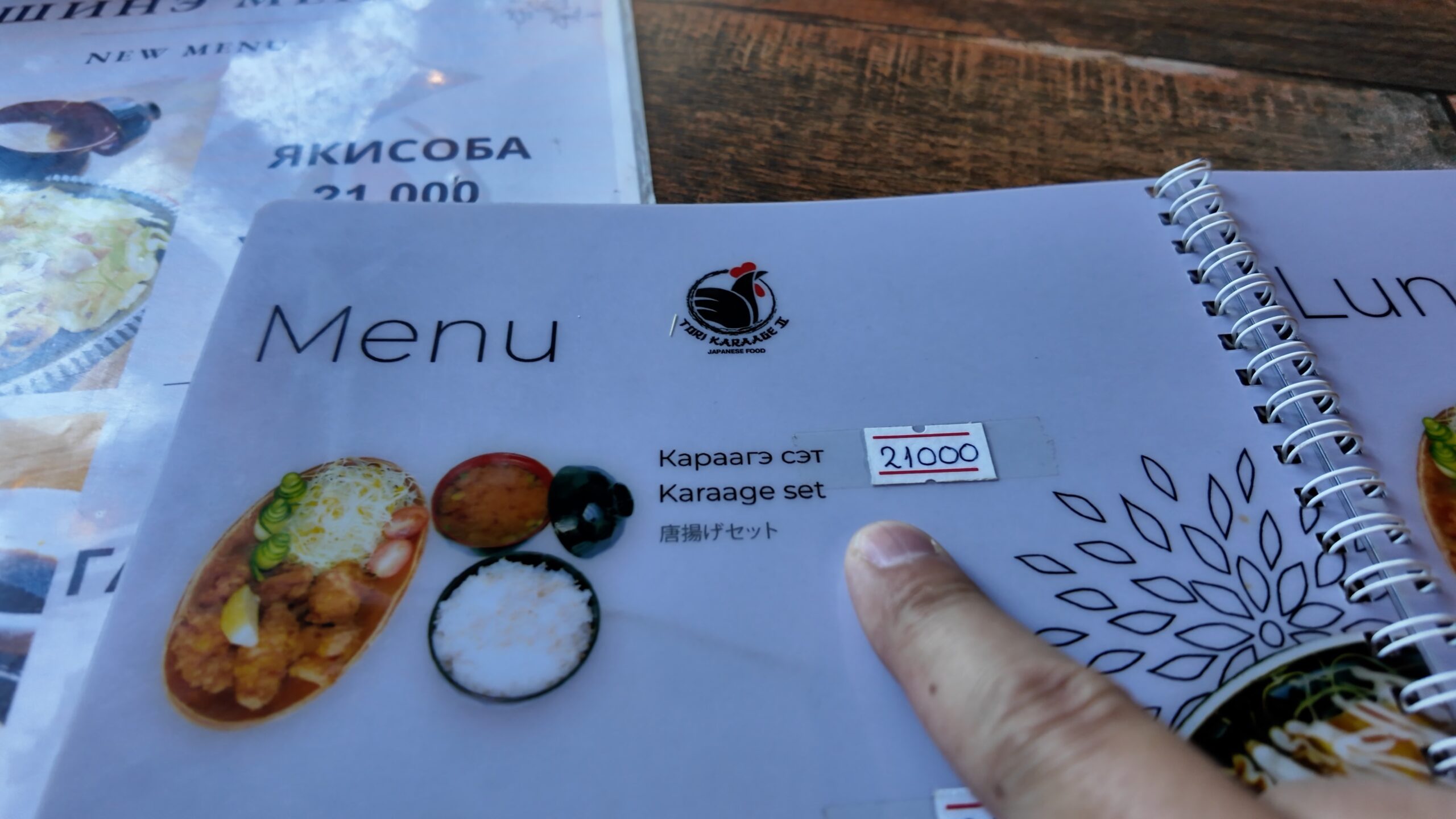 こちらが出て来た「唐揚げセット」です。この写真だけ見たらもう日本のお店?と思ってしまうくらいの、日本的な定食が出て来ました。モンゴルらしさは皆無ですが、異国の地で日本と変わらないような食べ慣れた食事を食べるのは、なんだか凄く安心感も出て来ます。それは宿泊先の東横インも同じだと思います。東横インを起点に国内旅行をしてランチに定食屋さんに入って食べるのと同じような感じで、モンゴルで異文化を経験しているという感じでしょうか。