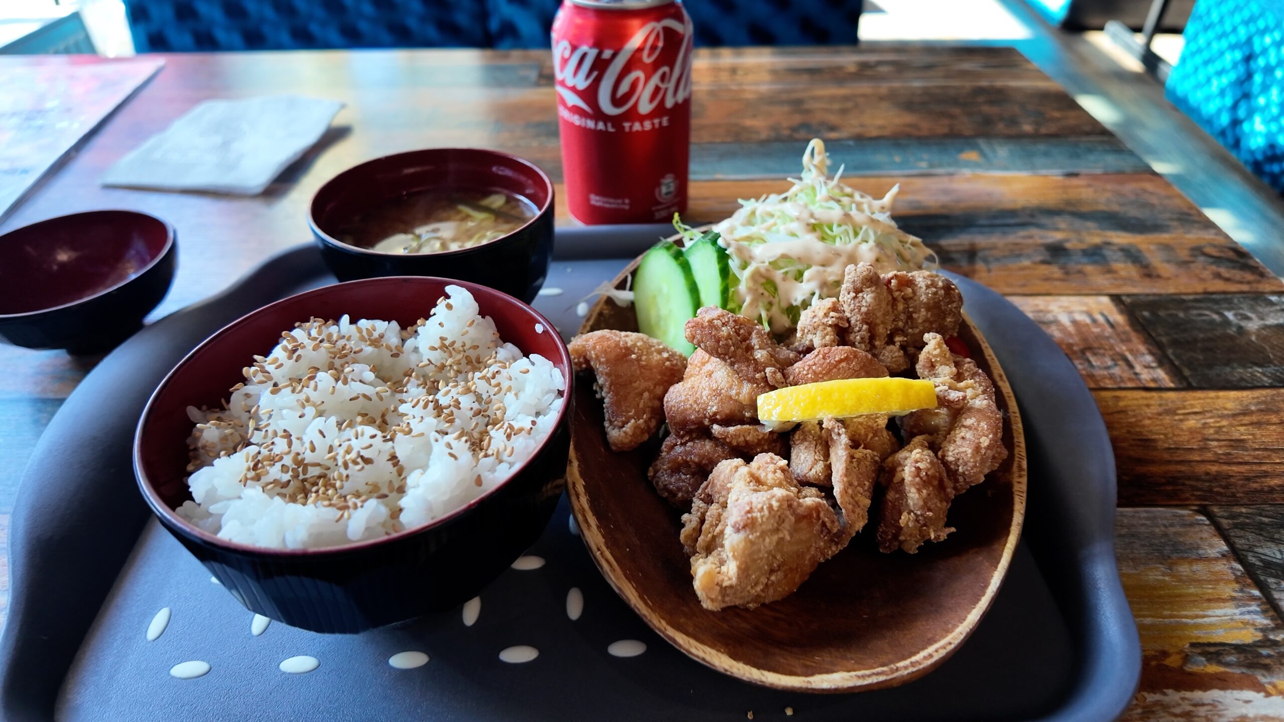 メニューには現地語、英語の他に日本語も記載してありました。メニュー内容も日本の定食屋さんが出すようなものばかりで、何を食べても良さそうな感じでしたが、お店の名前が鶏唐揚げなので、「唐揚げセット」を注文しました。夕方前という事で店内には私のみだったので、ゆっくり食事出来そうです。