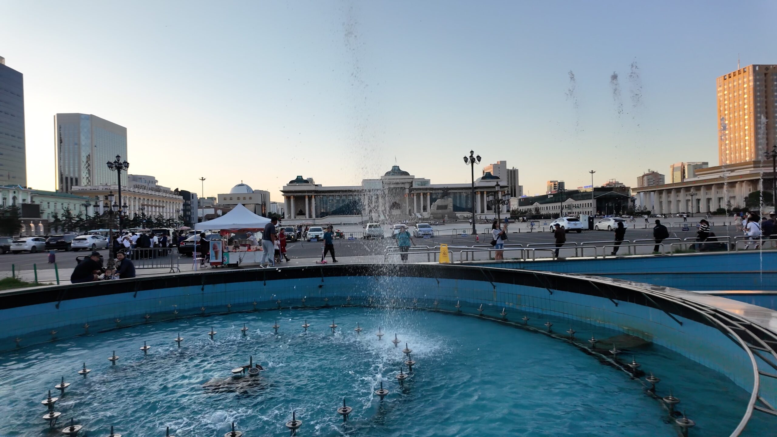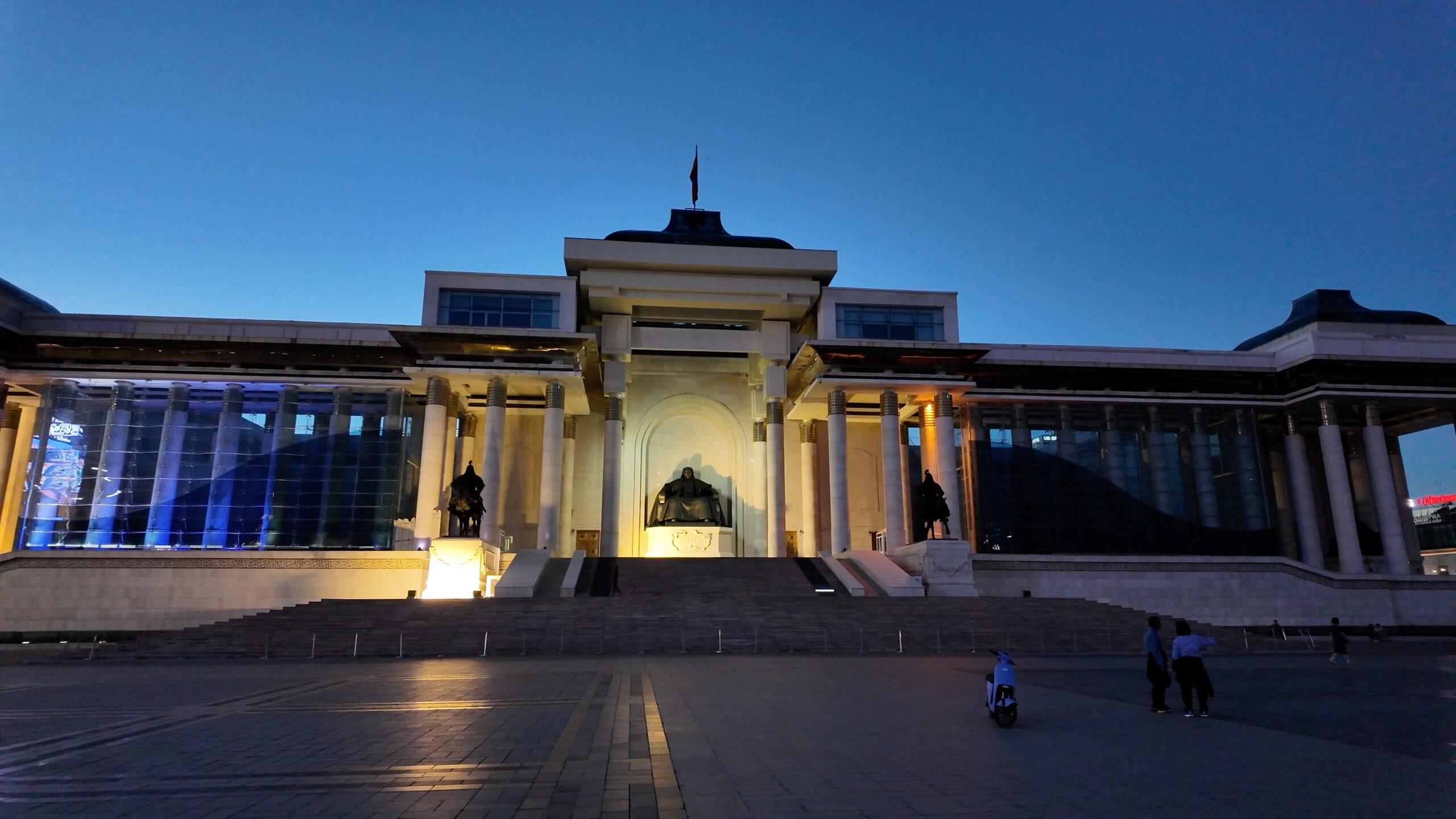 やって来たのは、スフバートル広場です。空港から最初にこちらに来て観光が始まったので、旅の締めもここかなと言うのと、恐らく夜景も綺麗なのではと思ったのでやって来ました。既に夜の8時半を過ぎていましたが、日が落ちるまではもう少しかかりそうです。待っている間に調べてみると、この日は、日の出:午前 5時14分(5:14 AM)、日の入り:午後 8時42分(8:42 PM)で、日の出から日の入りまでの日中時間は約 15時間28分との事でした。現地に来るまでこんなに日中の時間が長いとは知りませんでしたが、涼しくなって来たのもあり、日が落ちてくると広場に人が少しずつ増えてくるような感じでした。