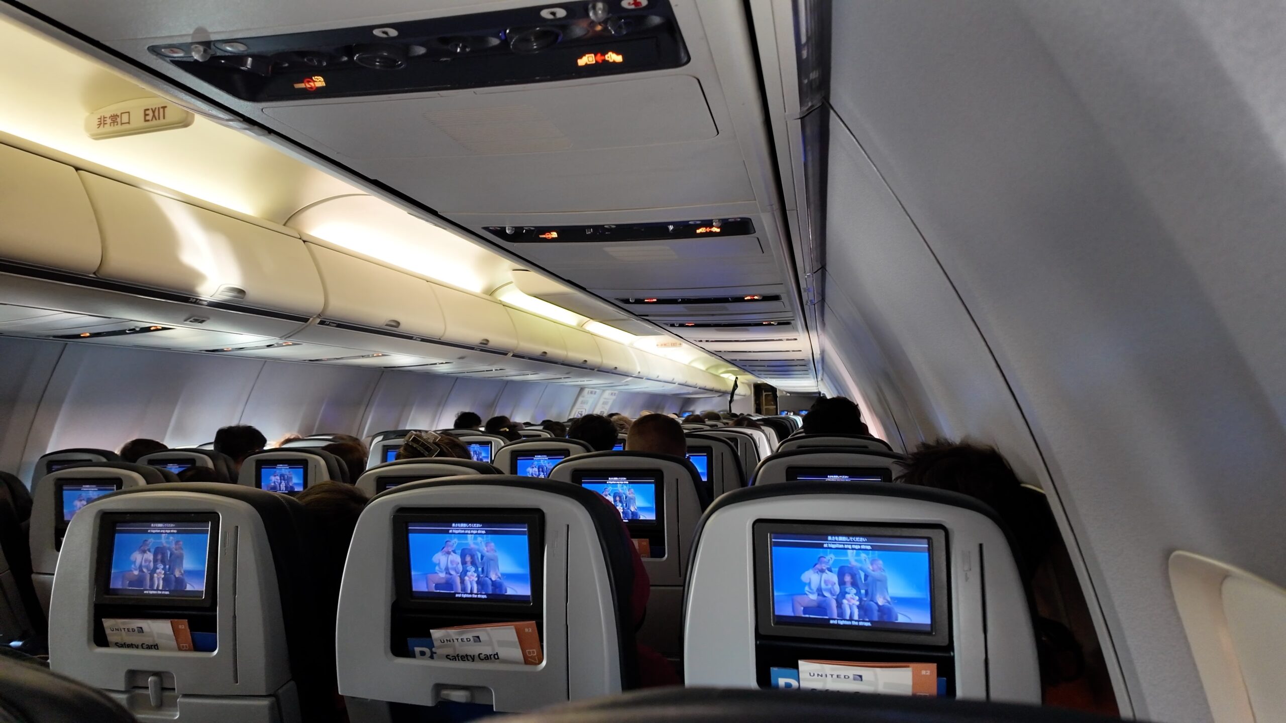 使用機材はB737-800です。アメリカ人が利用する飛行機だからさぞかしゆったりしているだろうと思いきや、膝前がついてしまうくらいでして、正直LCCのような足元の狭さでした。ブランケットが各席に用意されていました。