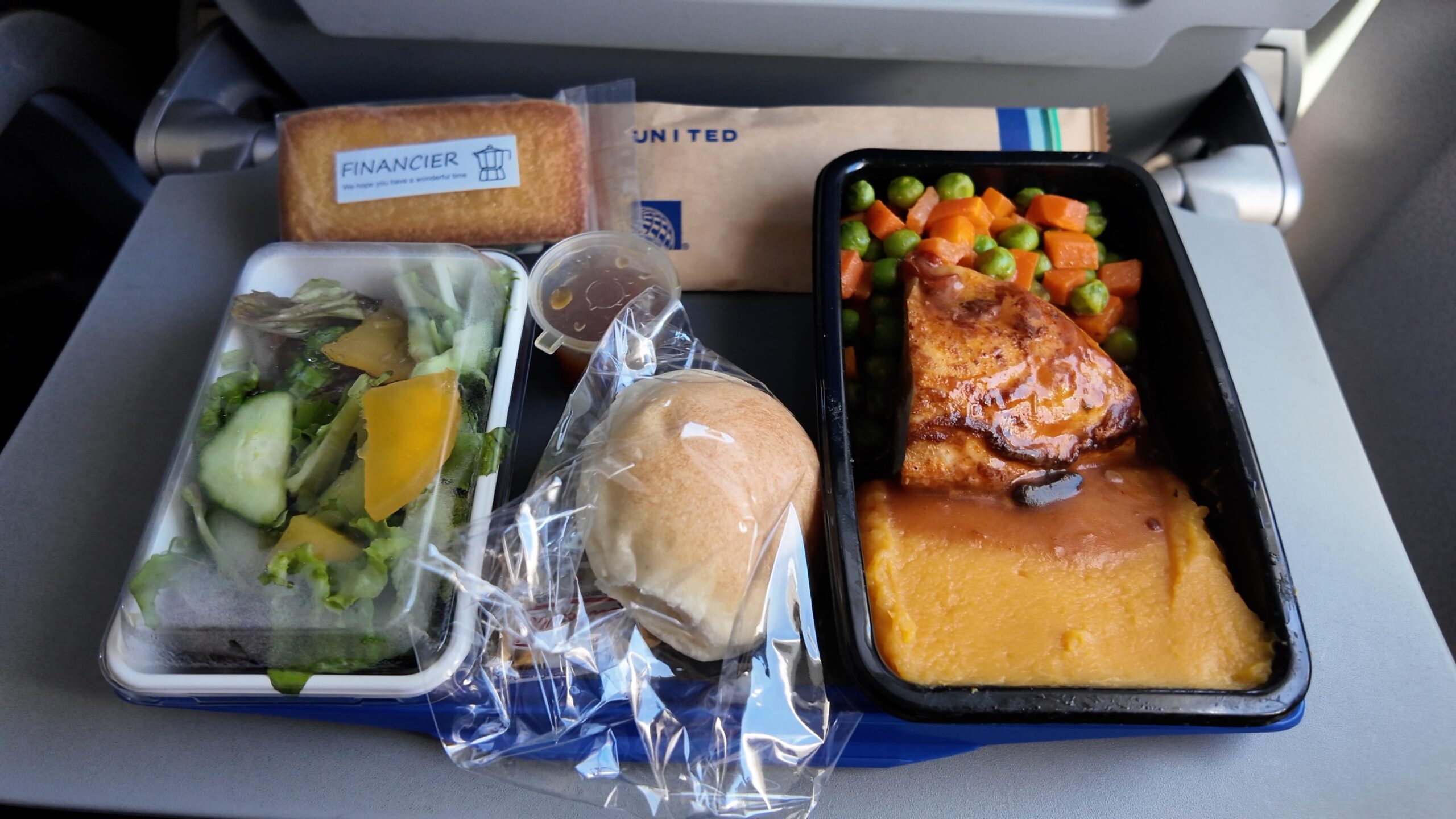 中国上空で食事が提供となりました。出発して約2時間後だったと思います。チキンを選択しました。お腹が空いていた事もあり美味しく頂きながら景色を見ていました。