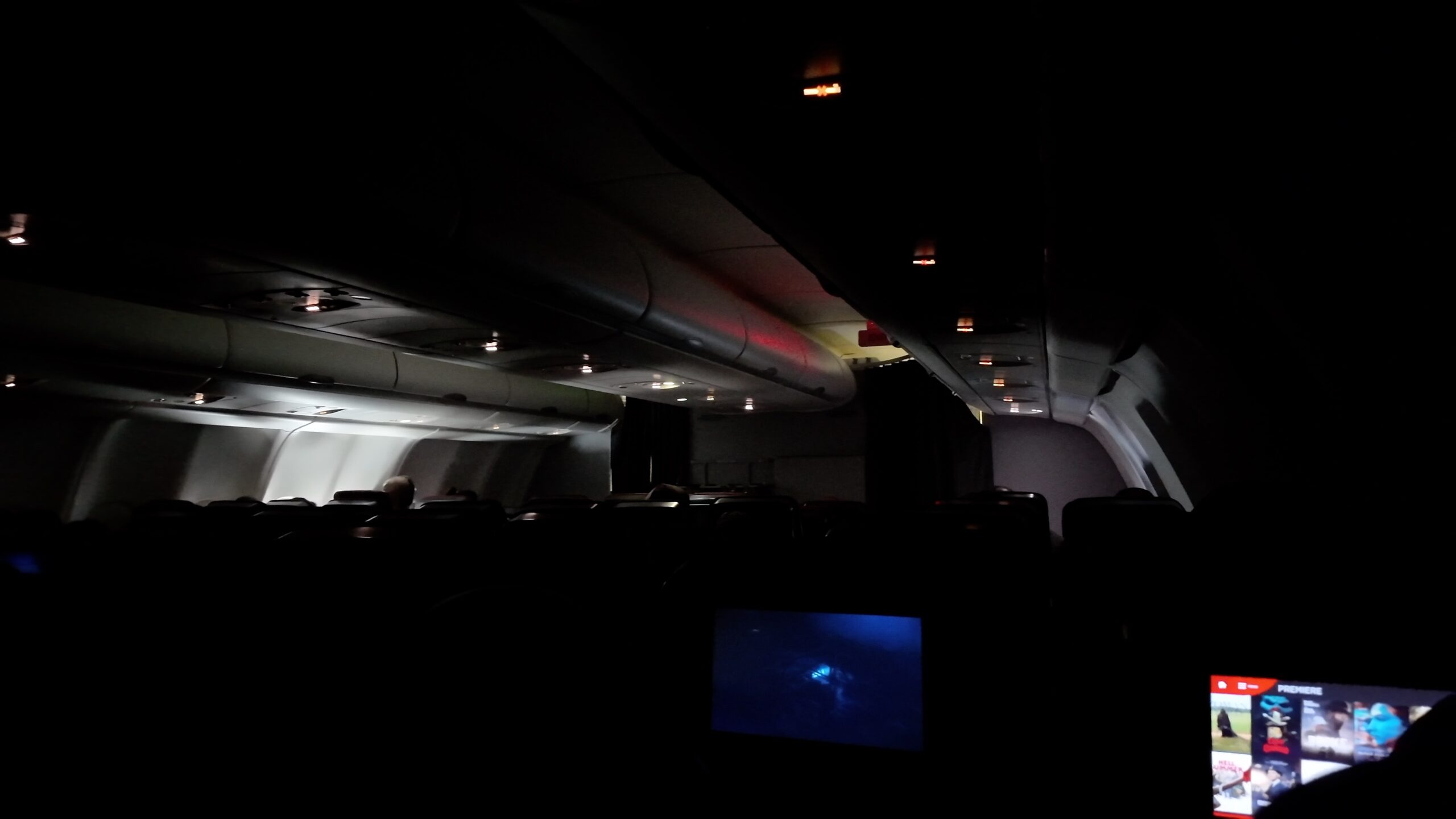 食事が終わると、機内照明が落とされました。前夜に羽田空港入りして仮眠しただけだったので、ここで少し仮眠して休む事にしました。スマホのチャージが出来なかったので、事前に準備したコンテンツを見て下手にバッテリーを減らすとシドニー到着後がどうなるのか不安だったのと、後ろが居なかったのでリクライニングも気兼ねなく出来たのもあり、色々と理由が重なりました。