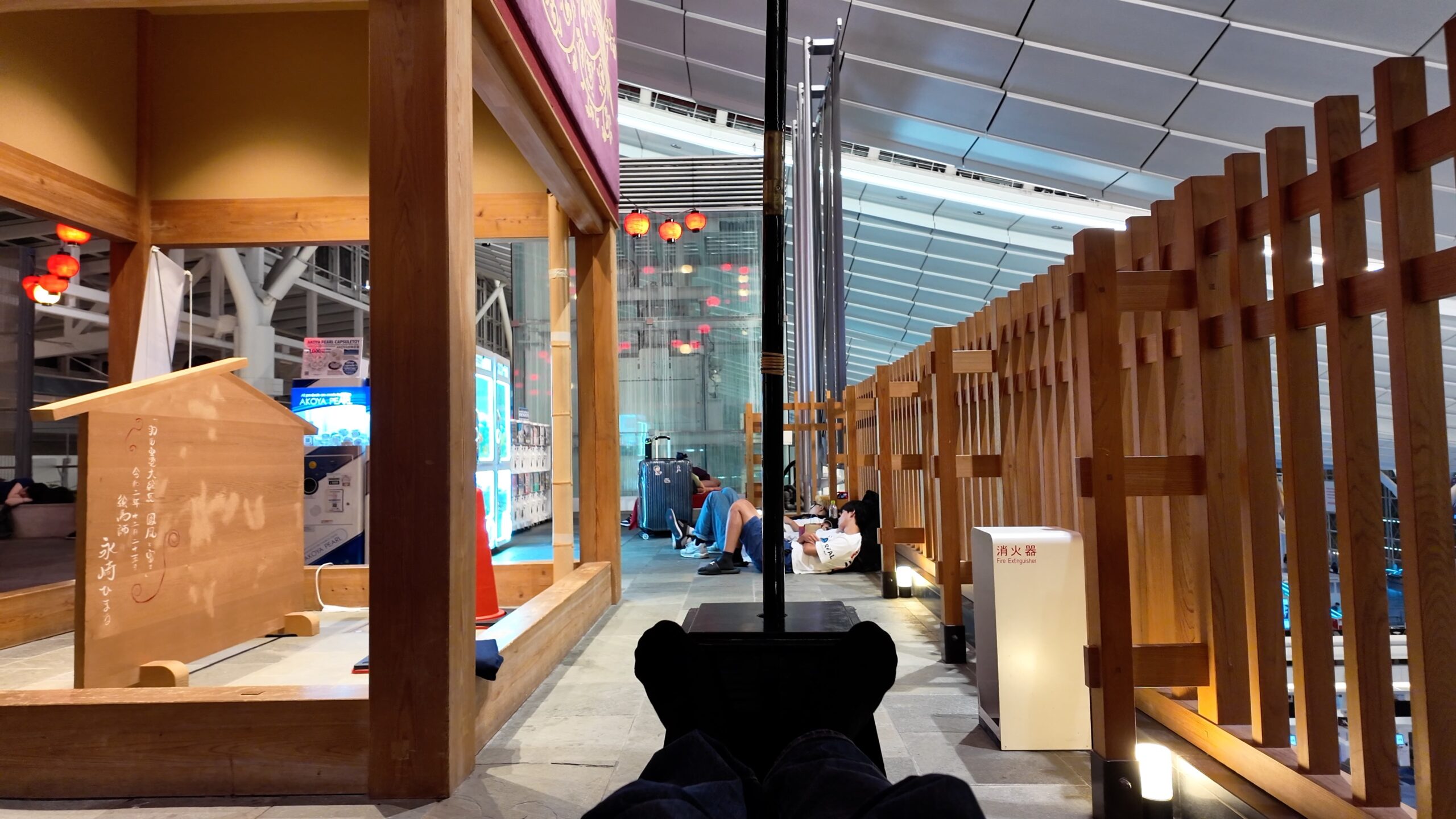 以前から何度もこのような事をしていて、ある程度の雰囲気も分かっている事もあり、良いのか悪いのか分かりませんが、慣れて来ていました。各社のカウンターがあるフロアーからエスカレーターで3階、4階に上がって仮眠出来そうな空いているスペースを確保しました。耳栓とアイマスクをして、チェックイン開始の時間前まで、とりあえずの仮眠を行います。毎回場所を取るのも難しいくらいで、この時もスペースがあるのか、探し回った挙句に見つかったと言う感じです。