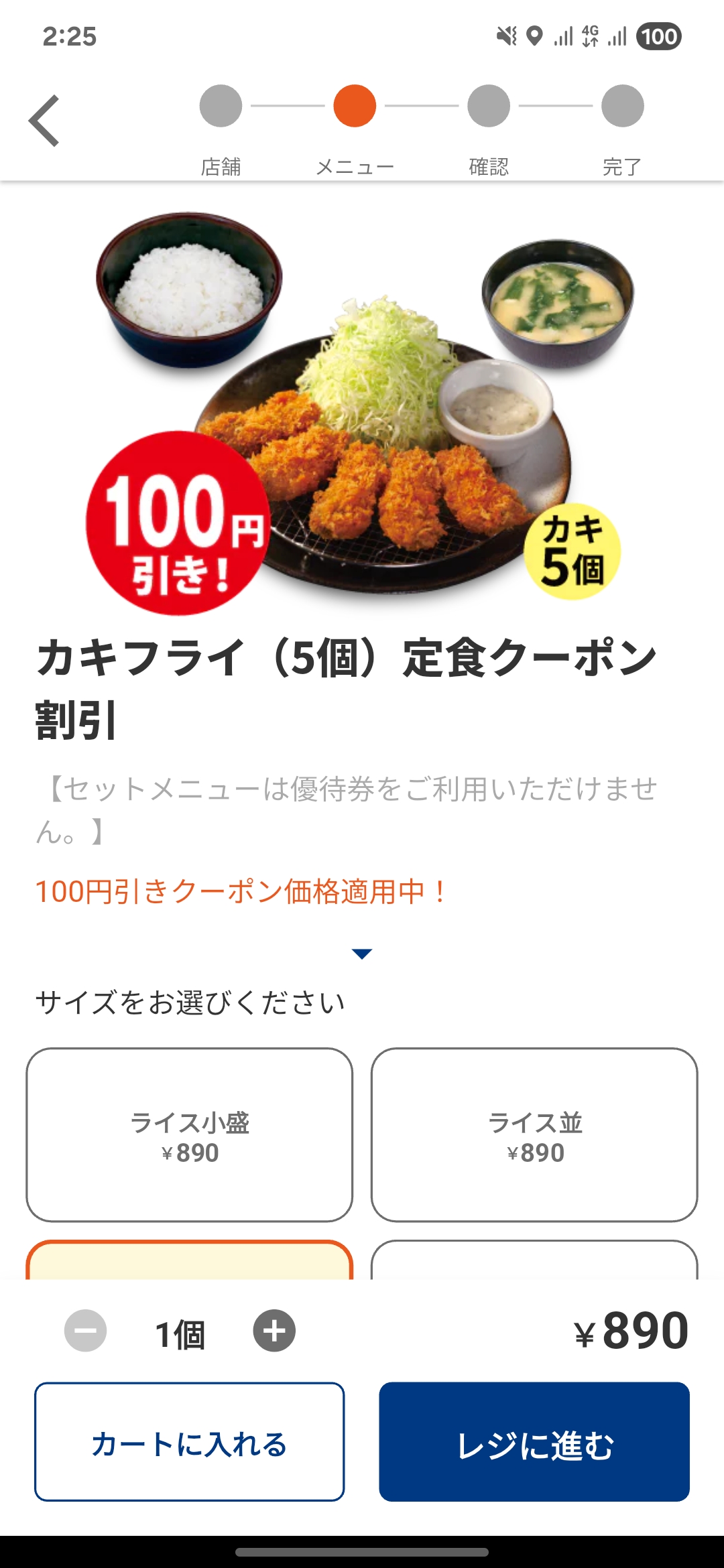 今回も、いつものように松屋公式アプリからモバイルオーダーで注文します。ちょうどアプリに100円引きクーポンが配信されていたので、これを使わない手はありません!ライス大盛も無料なので、そちらを選択。結果、990円のカキフライ定食(ライス大盛)を890円で注文できました。