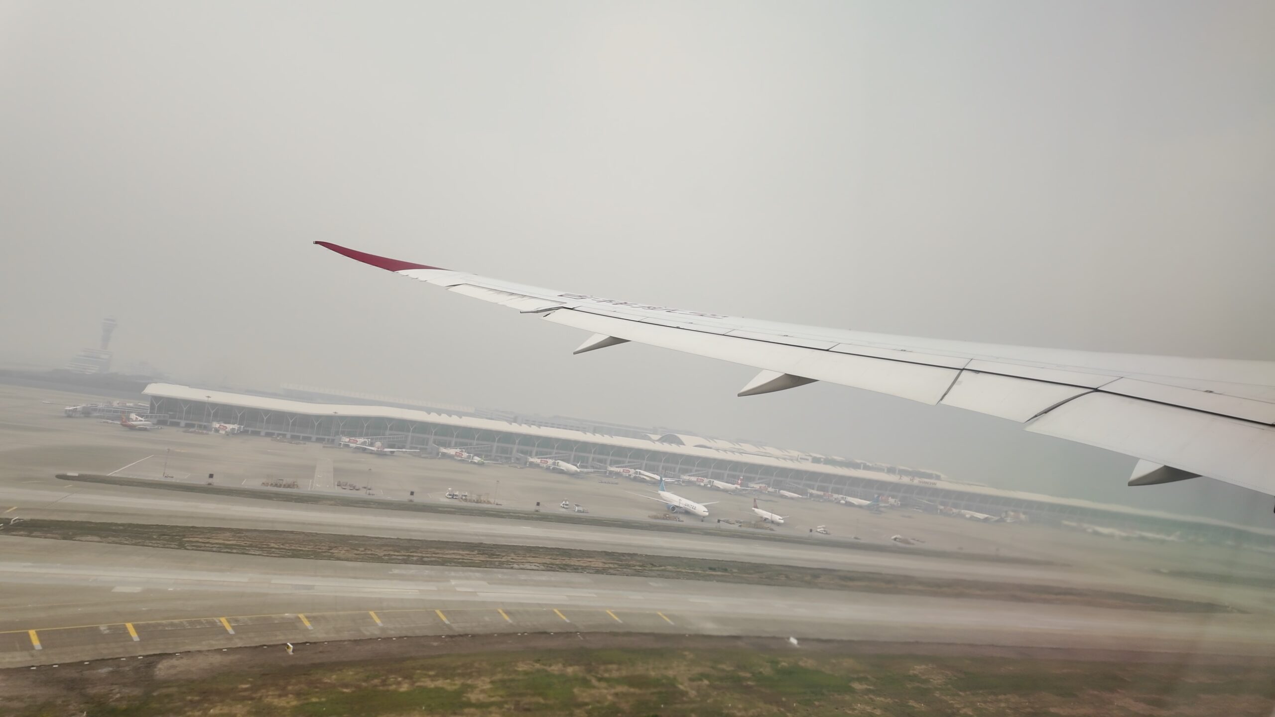 上海浦東国際空港を離陸しました。曇っていると言うよりはガスがかかっている感じで、空港の様子以外は殆ど外の景色を見ることが出来ませんでした。残念ですがこればかりは一期一会という感じでしょうか。