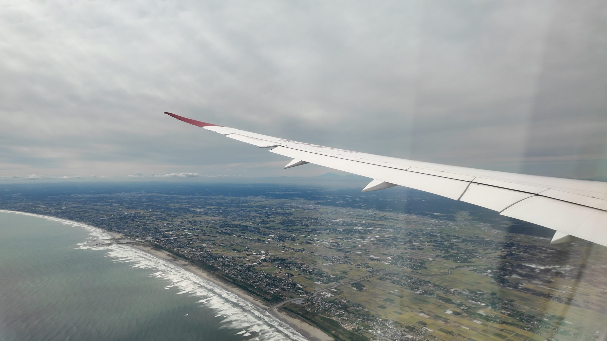 着陸態勢に入り外を見ると房総半島の東側を飛行していました。映像的には分かりにくいのですが、遠くに富士山を見る事が出来ました。長いヨーロッパ旅から戻ってきて、富士山を見ると「日本に帰国するんだな」というのを実感しました。