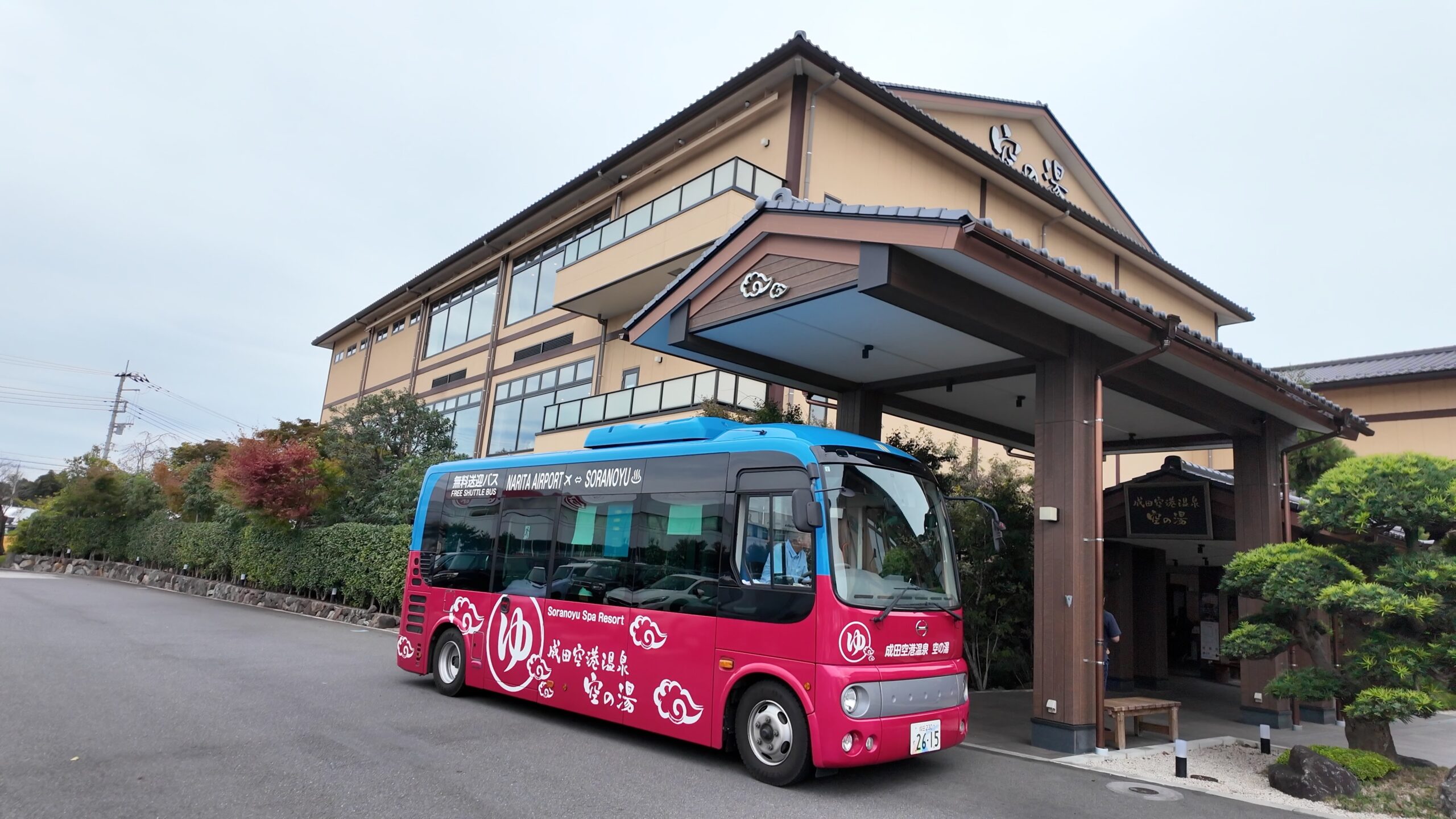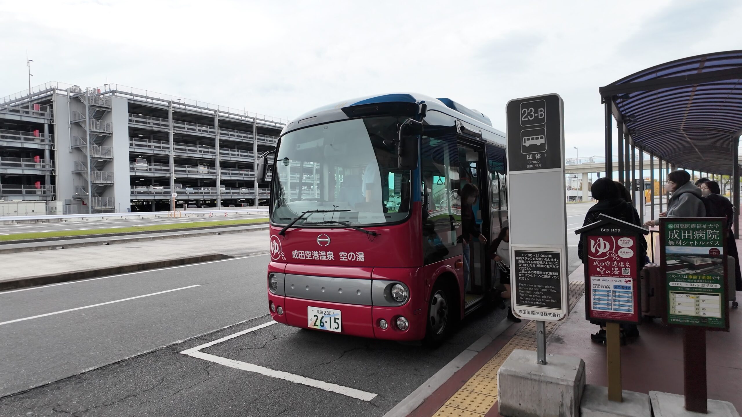 お昼過ぎに帰国となりました。ヨーロッパから乗り継ぎして体が疲れていたのと、サッパリしたいなという思いがありました。その一方で以前から成田空港温泉の存在を知っていて行ってみたいなという思いもあったので、そのまま自宅に向かわず、この機会に行ってみる事にしました。空港からの無料送迎バスの乗り場を確認してバスに乗車する事が出来ました。