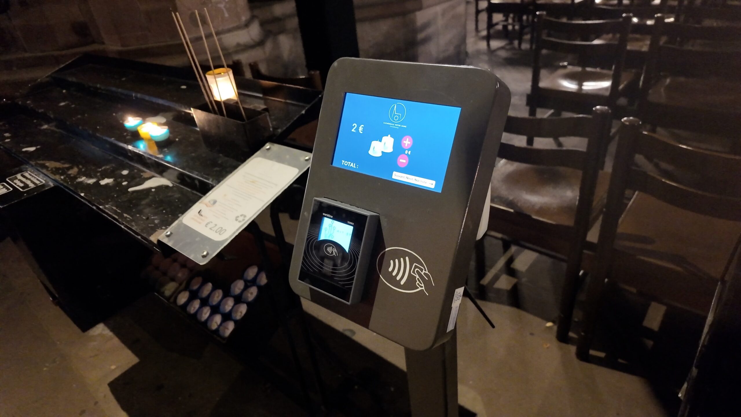 中は無料で入る事が出来ます。ろうそく(献灯)を購入して火を灯す事が出来るのですが、驚いたのは、その支払い方法でして、クレジットカードのタッチ決済が導入されていました。費用は2ユーロのようです。小銭がなくても、スマートに祈りを捧げることができます。自分の願いを込めて、あるいは大切な誰かを想って灯す火は、静かな聖堂の中でとても幻想的に輝きます。古い伝統を守りつつ、キャッシュレスという現代の便利さを取り入れる姿に、ヨーロッパの「今」を感じます。
