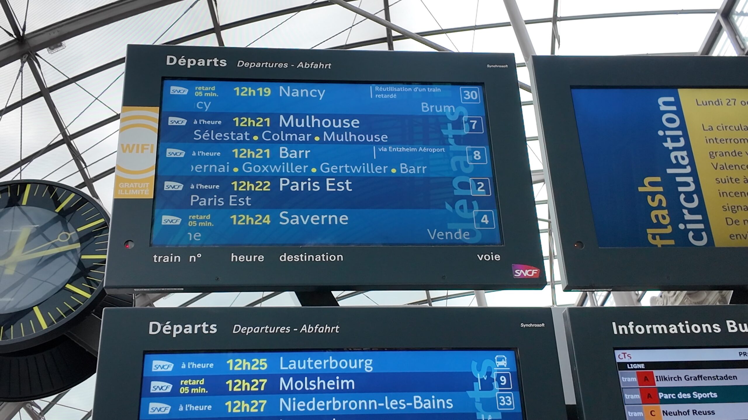 この後はコルマールという街に向かいます。事前にインターネットでチケットを購入していたので、コルマールへ行く列車を確認すると、7番線から出発する快速列車のようなのでホームに移動します。ストラスブール駅には改札口が無いのでそのままホームに行く事が出来ます。
