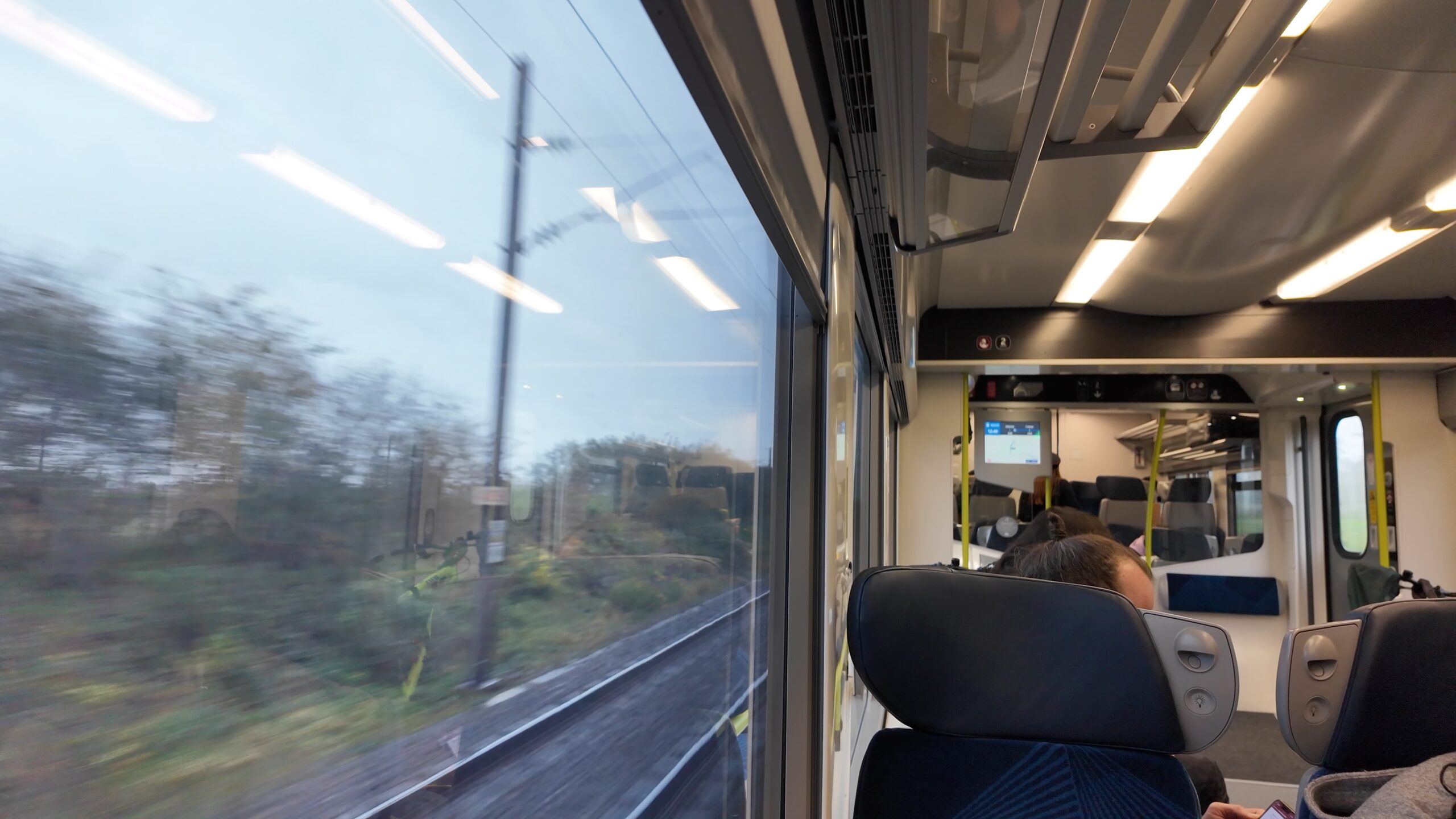 ストラスブール駅を出発です。始発列車だったようで、余裕を持って座れました。地方の快速列車なのでどの程度のお客さんが乗車するのか全く想像出来なかったのですが、思った以上にお客さんはいました。午前中に街歩きをずっとしていたので、スマホやカメラのバッテリーが減っていたのですが、コンセントが車内にあったので助かりました。