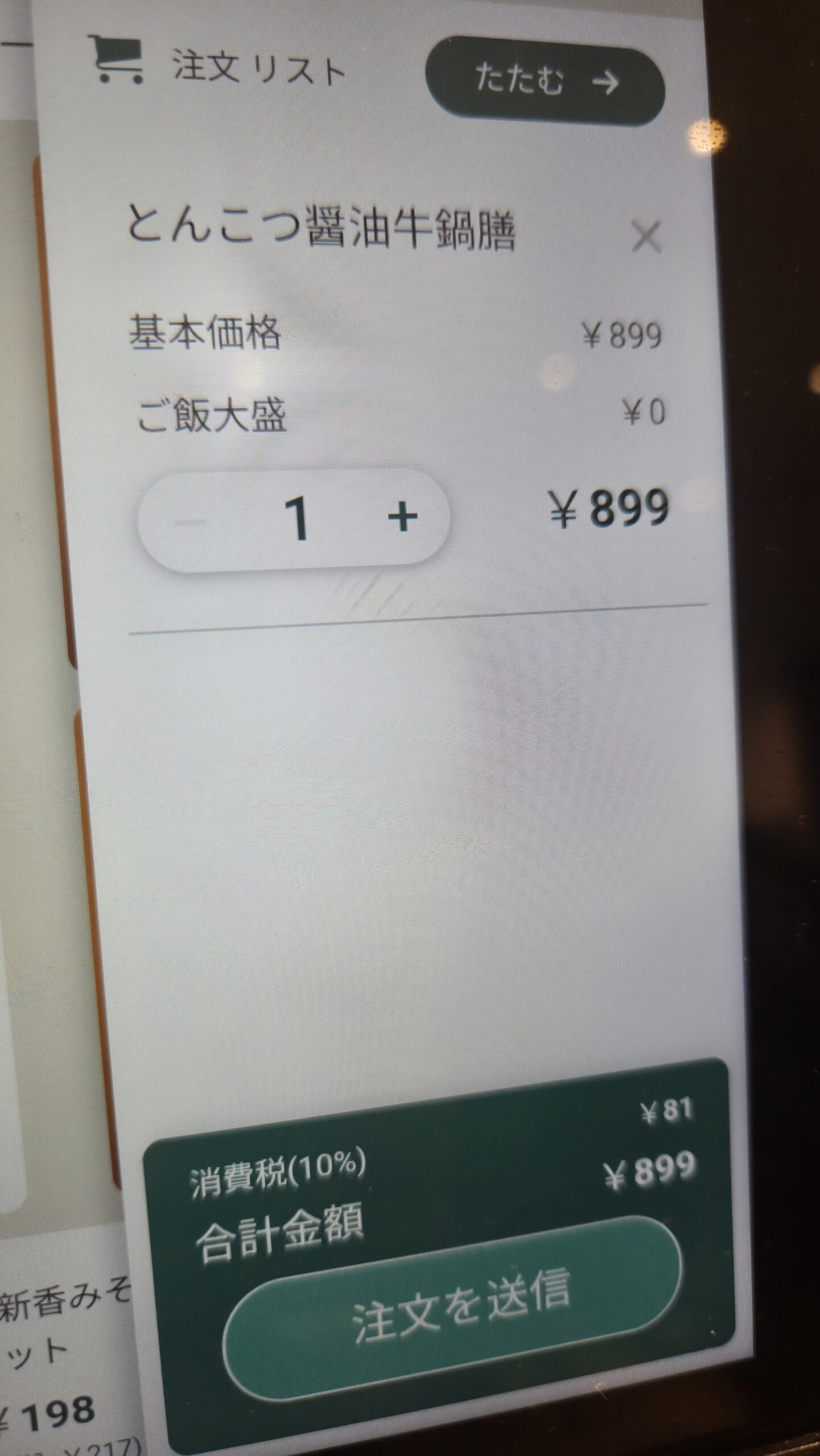 どちらにしようか迷いましたが、やはりまだ食べたことのない「とんこつ醤油牛鍋膳」を、ご飯大盛りで注文。お値段は税込899円です。店内には、どちらかはわかりませんが、すでに鍋膳を食べているお客さんも数人いました。まだ冬らしさは感じないものの、鍋膳を待ち望んでいた人が多いということでしょうか。