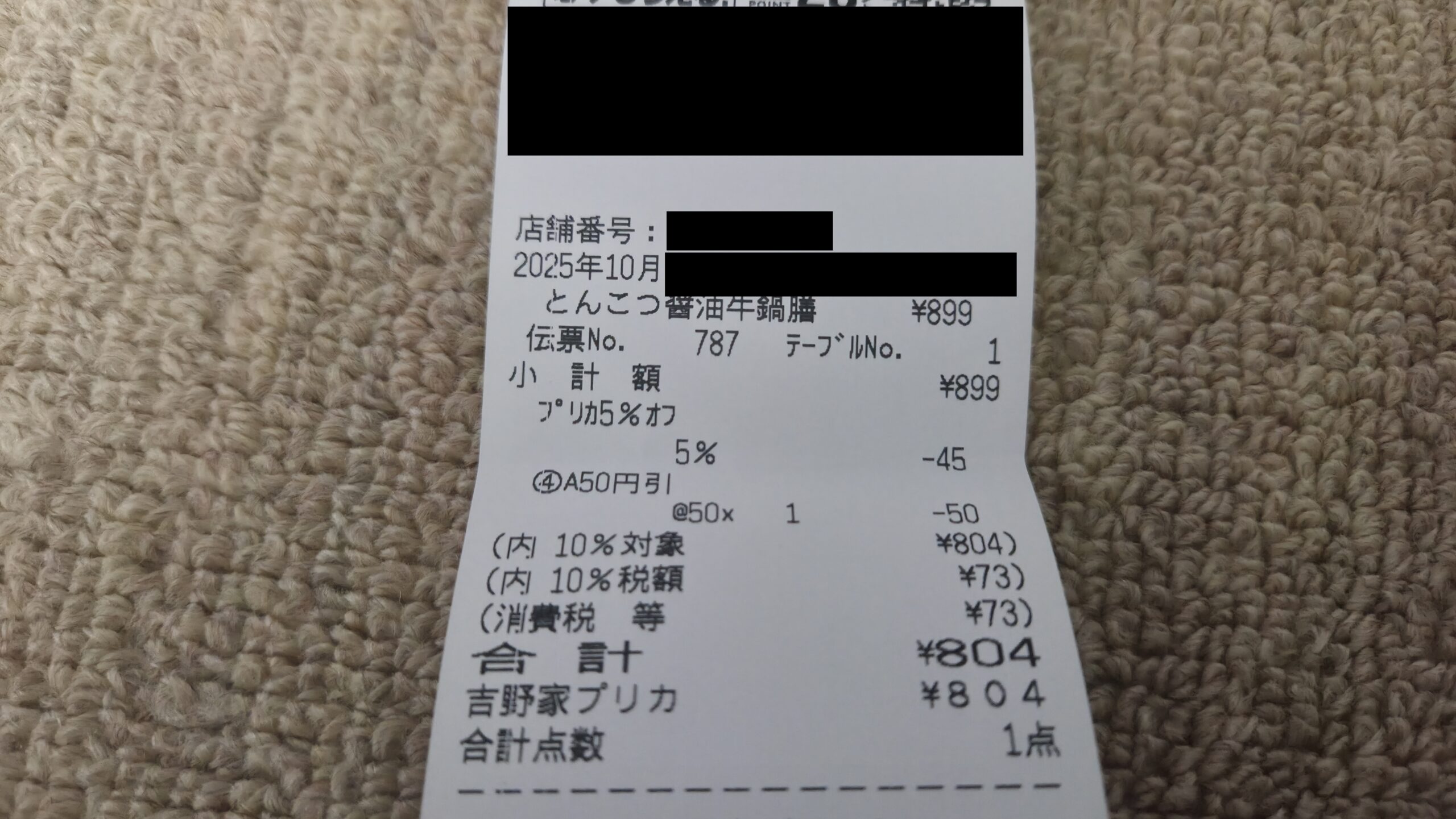 お会計ですが、今は吉野家プリカがとてもお得です。チャージで10%増額されるうえ、さらに支払い時に5%オフになるので、実質15%お得になります。