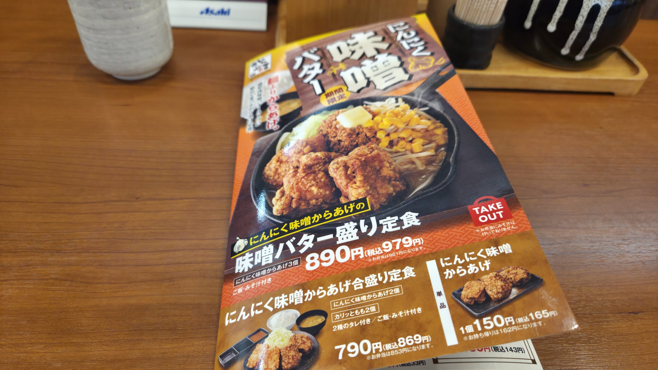 今回ご紹介するのは「にんにく味噌からあげの味噌バター盛り定食(税込979円)」。メニュー名に“味噌”が二度登場する、ちょっと不思議な響きの定食です。いったいどんな仕上がりなのか気になって、好奇心のまま食べに行ってみることにしました。