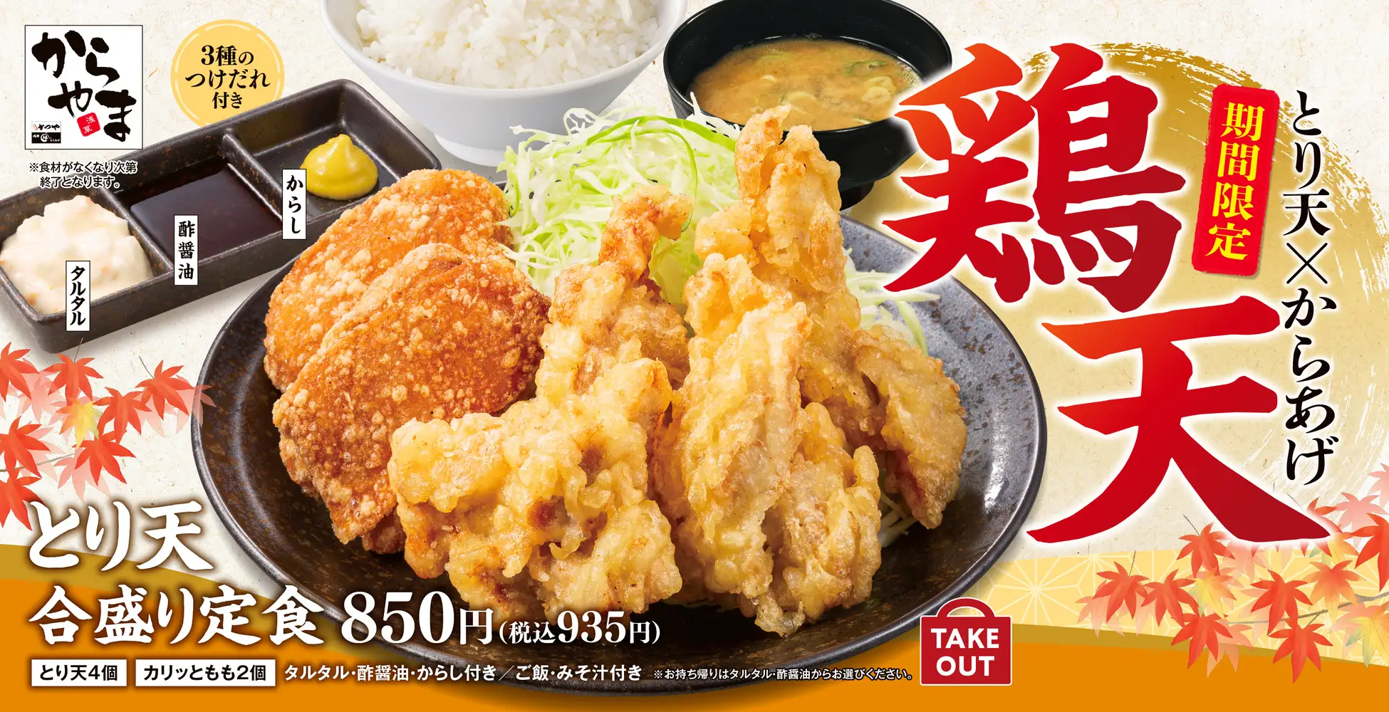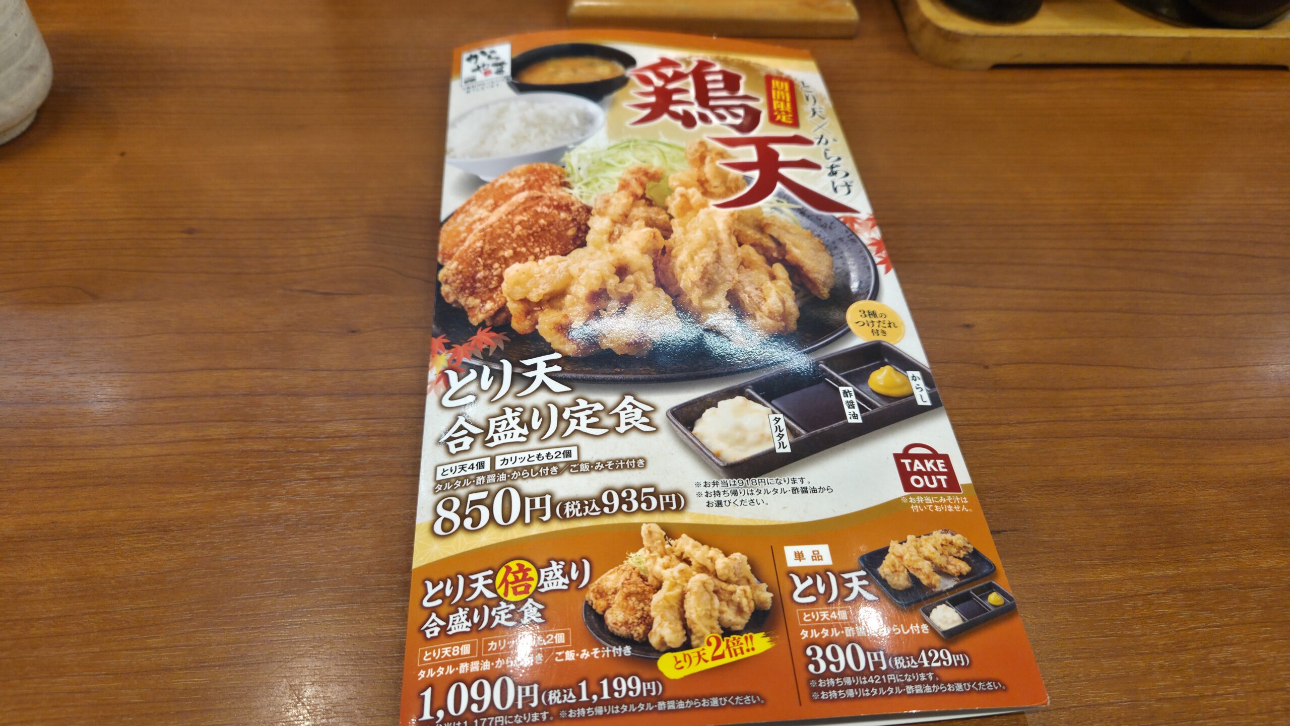 お店に入ると、いつも通り期間限定メニューが表紙を飾っていました。単品のとり天があるあたり、テイクアウトが多い「からやま」らしいラインナップです。倍盛りの定食もあって、こちらは1,199円。とり天が8個にカリッとももが2個付くので、コスパ的には意外とこっちの方が良いのかもしれません。ただ、さすがにとり天8個は食べ切れる自信がないので、素直に「とり天合盛り定食(税込935円)」を注文しました。