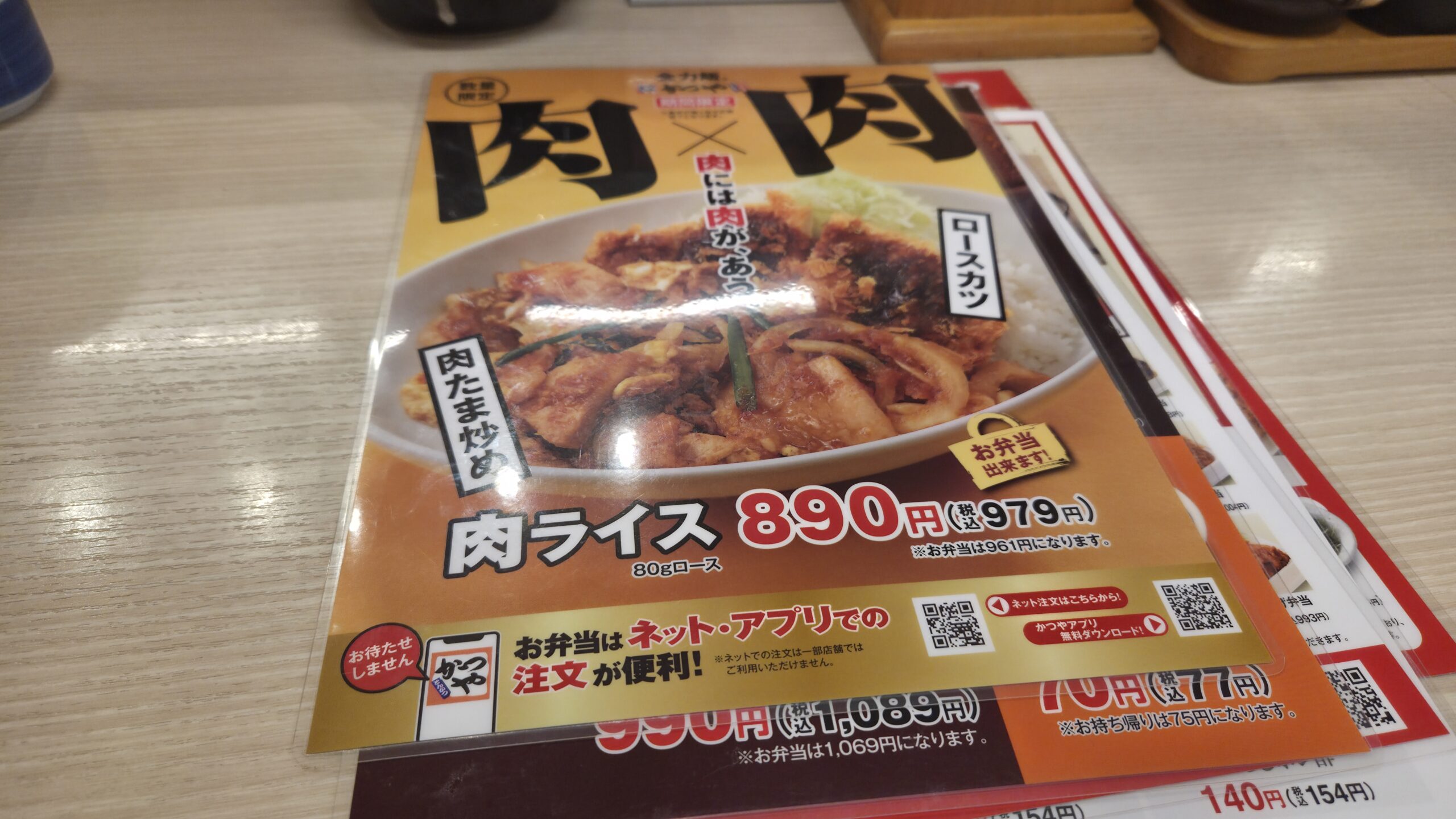 お店に到着して席に着くと、目当てのメニューを発見。画面いっぱいに「肉」の文字が並んでいて、思わず「何回言うんだ」とツッコミたくなるほどの“肉推し”です。定食はなく、この一品のみの提供だったので迷わず注文しました。単品なので大好きなとん汁は付いていません。税込979円で、注文すると1,000円を超えますが、かつやに来てとん汁を頼まないのは何か違う気がして、小サイズのとん汁も一緒にお願いしました。