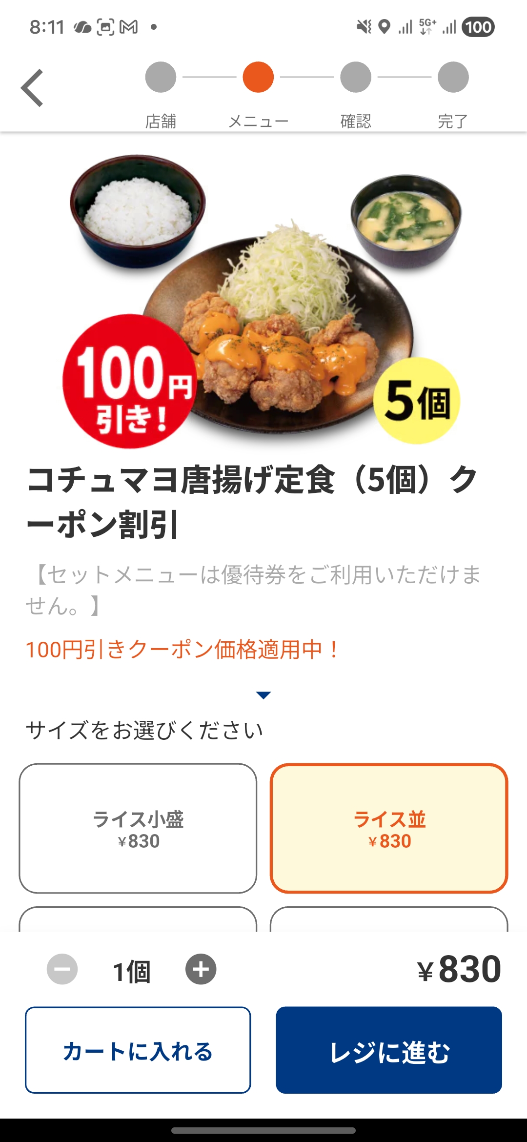 注文はいつも通り公式アプリから。クーポンを確認すると100円引きが使えたため、通常価格930円の「コチュマヨ唐揚げ定食」を830円で注文できました。唐揚げ5個でこの価格ならなかなかのコスパです。松のやは全体的に価格と満足感のバランスが良く、ありがたいですね。今回はライス普通盛りにしましたが、大盛・特盛でも同一価格なのは今の時代なかなか貴重だと思います。ちなみに特盛はどのくらいの量なのか、実は頼んだことも見たこともありません(笑)