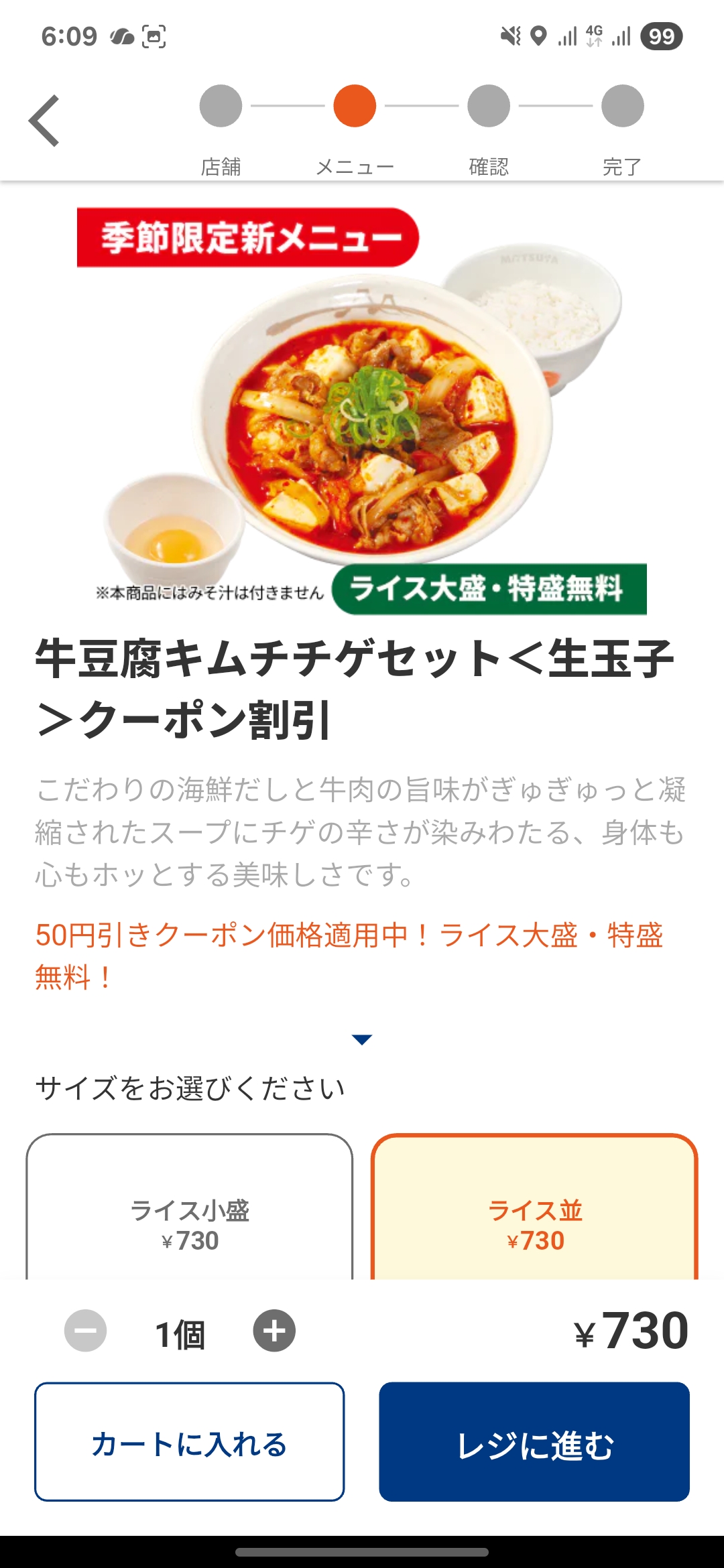 今年の牛豆腐キムチチゲセットは780円。昨年のブログを見返すと750円だったので、30円の値上げです。30円なら許容範囲かなと思いつつも、物価高に慣れてしまって感覚がわからなくなっている気もします。ただ、いつも通り公式アプリのモバイルオーダーを使うと、昨年同様50円引きクーポンがあり、730円で注文できました。玉子は生と半熟から選べて、私は今年も昨年同様、生玉子を選択。自然と同じ選択をしてしまうものですね(笑)。