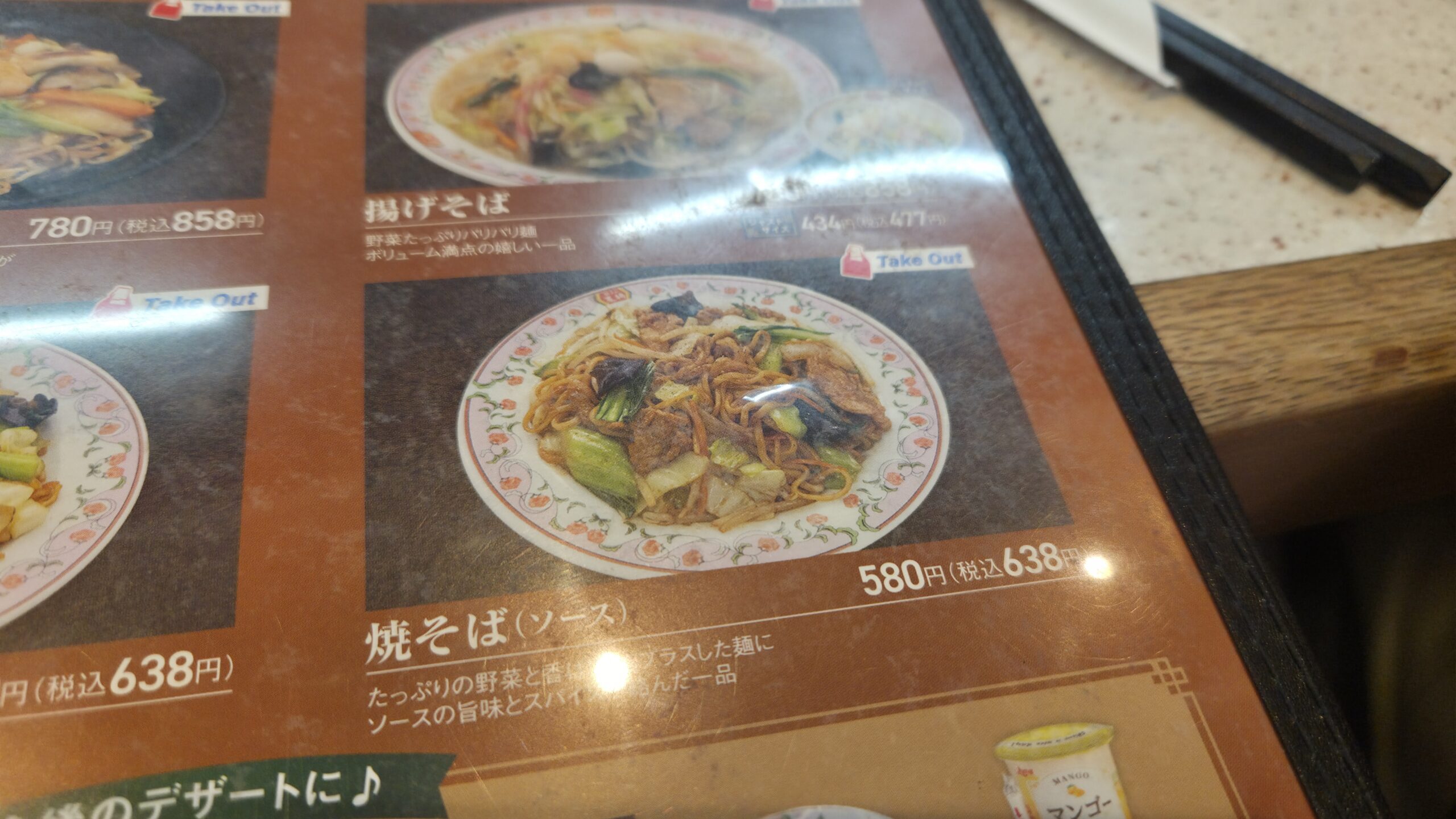 少しお昼のピークを外して行ったのですが、大感謝祭の影響なのか、店内は思った以上に混雑していました。何を食べようかメニューを眺めていると、久しぶりに「焼そば(ソース)」が目に入り、今日はこれだ!と注文。普段は醤油焼そばばかり食べていますが、なんとなくこの日はソースの気分でした。