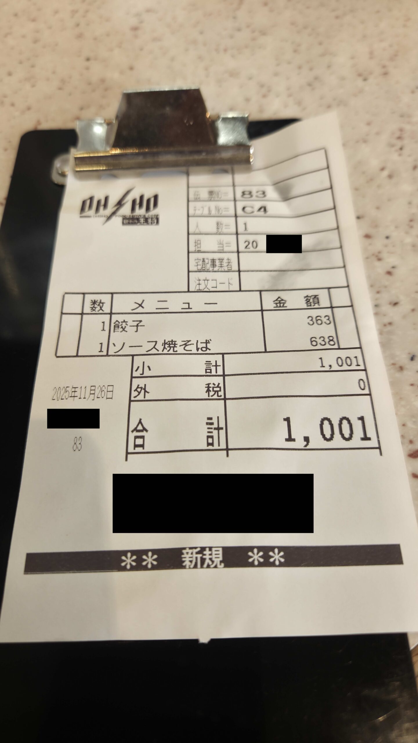 食事が終わりお会計の時間です。伝票を見ると税込1001円と計算通りになっている事を確認して、レジに行きます。