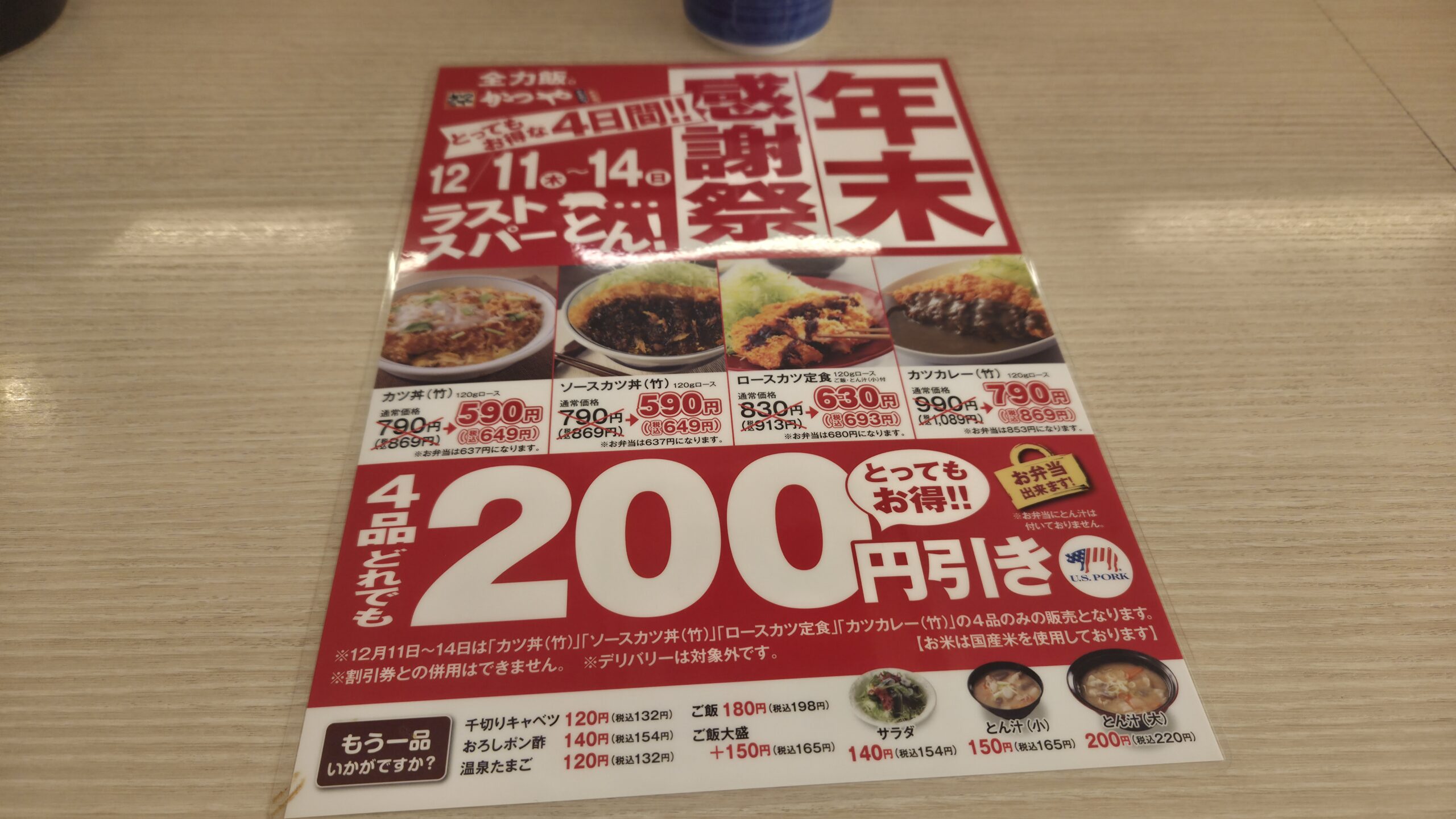 年末になると色々なお店でセールが行われますが、かつやの場合は特定の4品が200円引きになるセールです。割引券は使えないため、普段割引券を使っているリピーターからすると、通常より100円引き程度の感覚かもしれません。それでもお得なことには変わりないので、2025年の今年も当然のように行くことにしました。