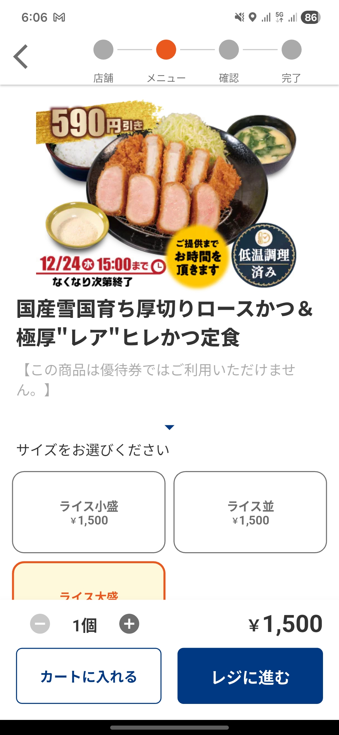 注文はいつも通りモバイルオーダーです。590円引きとはいえ、松のやで1,500円の定食を注文した記憶がなく、「本当にこれでいいのかな?」と少し緊張しました。かつのボリュームを考えるとライスは並でも良さそうでしたが、せっかくなので大盛で注文することに。