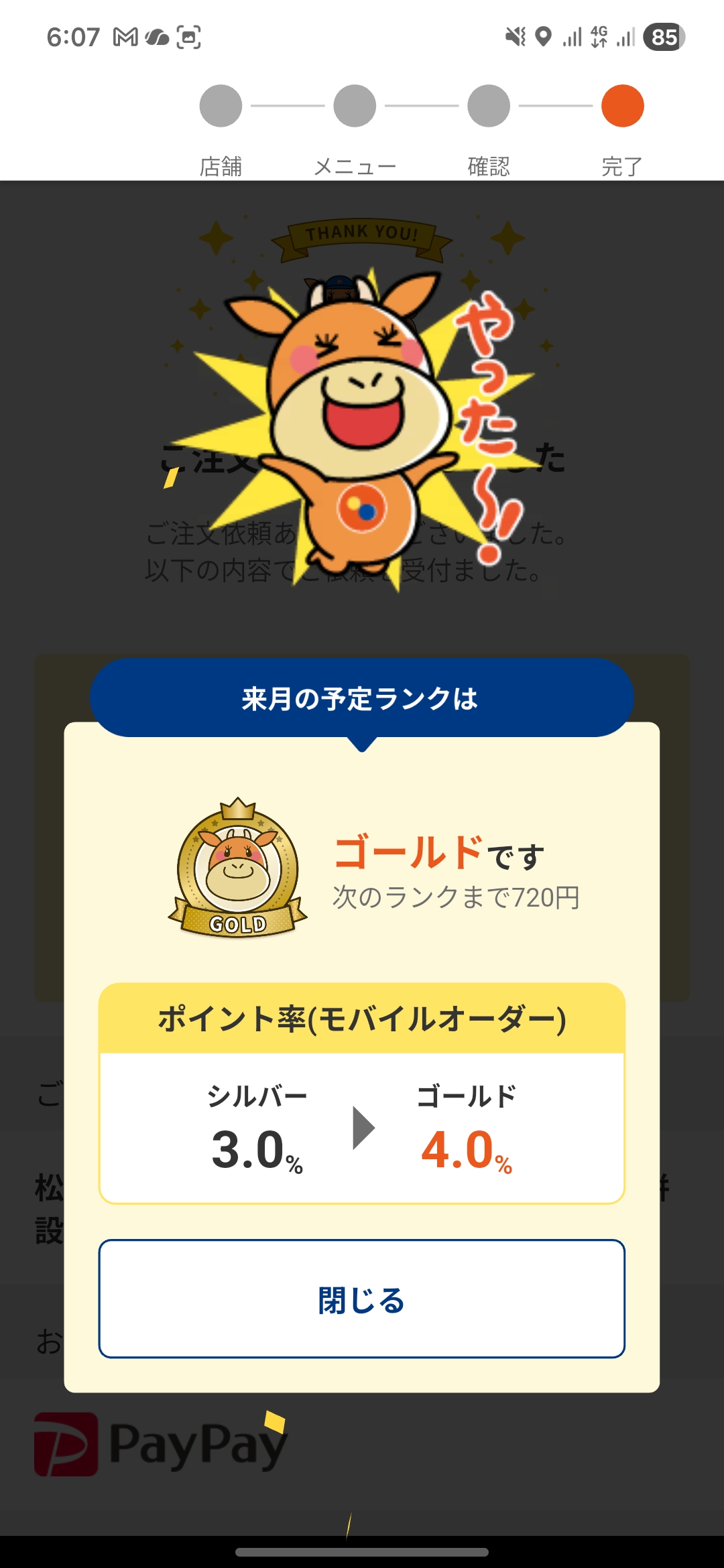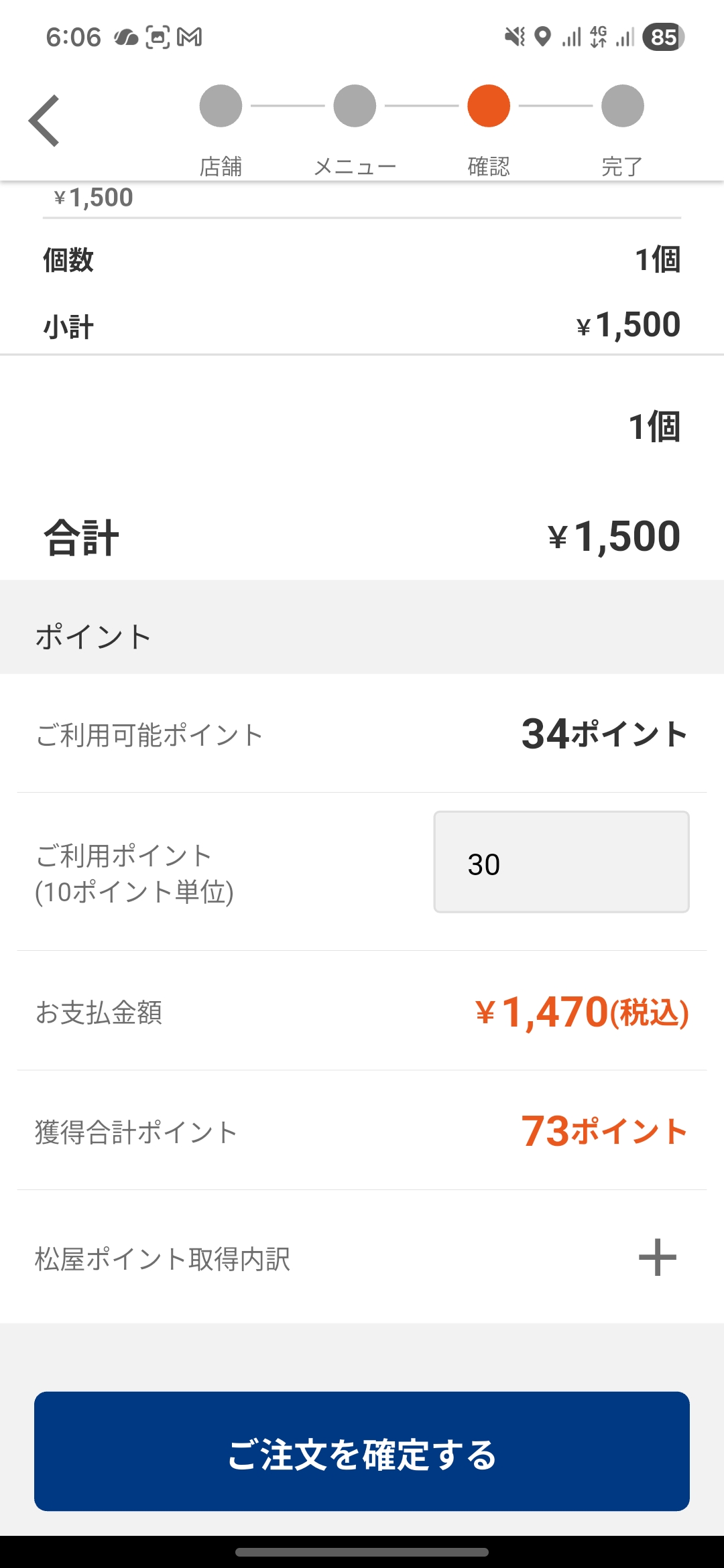元々持っていた30ポイントを使って、支払いは1,470円になりました。さらに次回使える松屋ポイントが73ポイント付与されるので、やはりモバイルオーダーはお得だなと感じます。ちなみに12月のランクはプラチナで、ポイント還元率は5%でした。