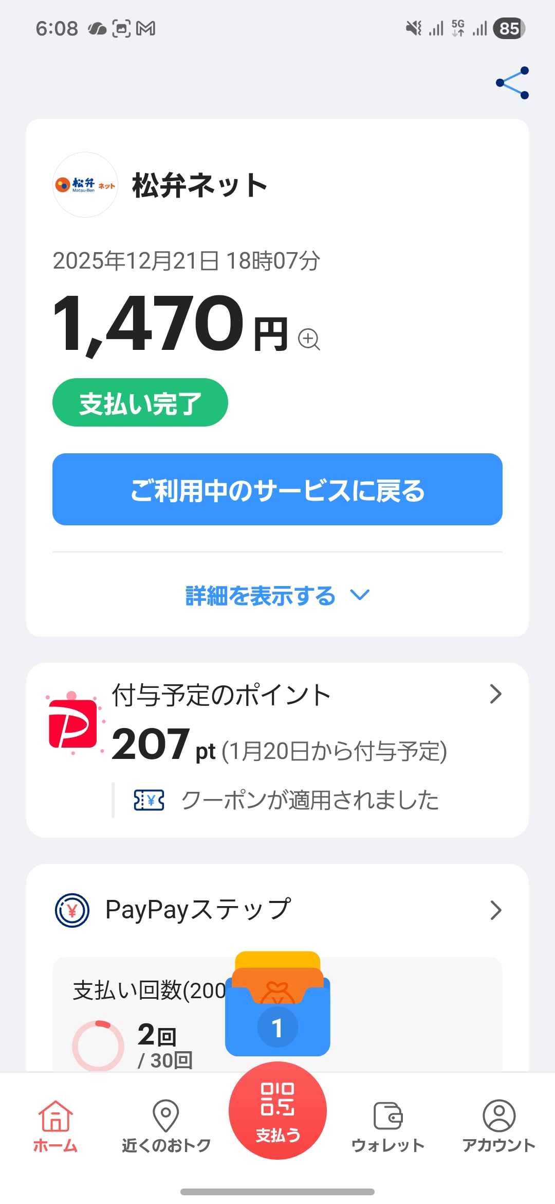 この時はPayPayで800円以上支払うと20%還元されるクーポンも配信されていたため、支払いはPayPayにしました。結果、207ポイントを獲得。あまり「実質◯円」という言い方は好きではないのですが、1,500円の定食を1,300円前後で食べられたと考えてもいいのではないでしょうか。モバイルオーダーと支払い方法を工夫するだけで、ここまで差が出るのは大きいですね。