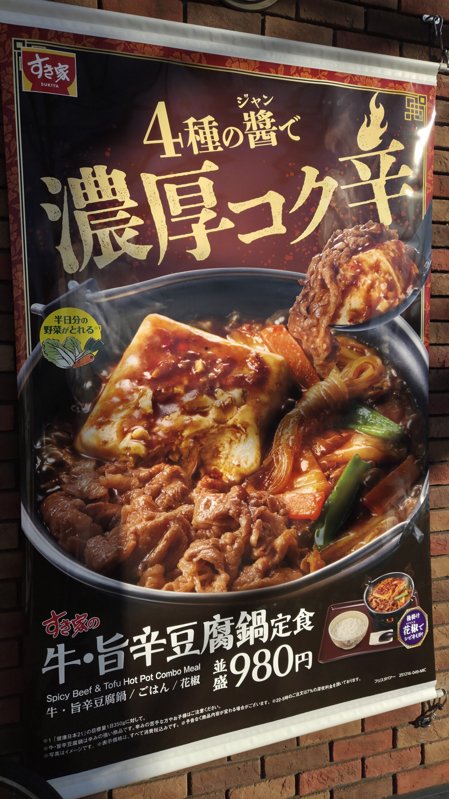 今回ご紹介するのは「牛・旨辛豆腐鍋定食(並盛・税込980円)」です。牛肉を使っているとはいえ、牛丼チェーン店が鍋料理を出すのも、今ではすっかり珍しくなくなりましたね。肌寒い季節になると自然と鍋が食べたくなり、各社が競うように鍋定食を販売していますが、その中でも少し他社と差別化されているのが、この「牛・旨辛豆腐鍋定食」だと感じました。実際どんな感じなのか、気になったので食べに行ってみることにしました。
