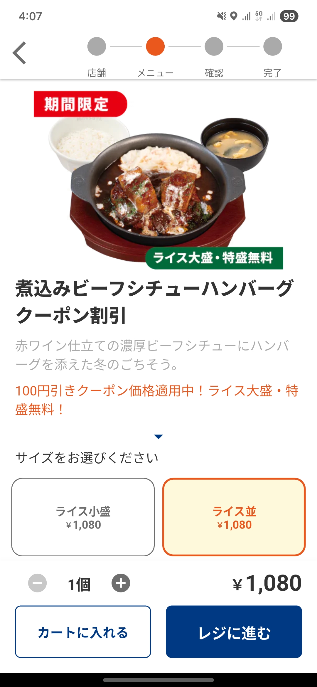 この日も、いつも通りモバイルオーダーから注文。サラダがあれば嬉しいですが必須ではないので、今回は100円安い「煮込みビーフシチューハンバーグ(1,180円)」を選択しました。ちょうど公式アプリで100円引きクーポンが出ていたので、お会計は1,080円。