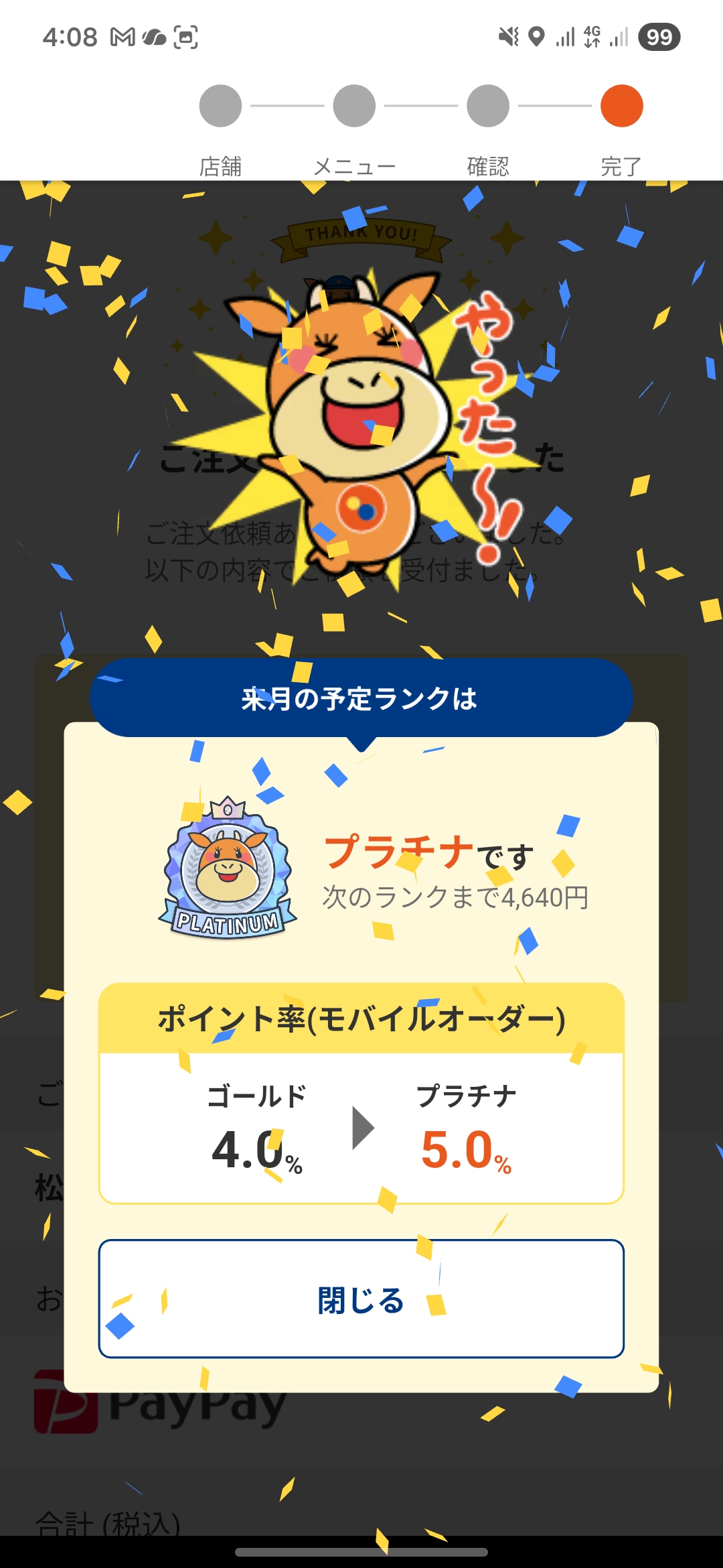 さらに前回までに貯まっていた70ポイントを使い、最終的な支払いは1,010円になりました。2025年12月は松屋ポイントがプラチナランクだったため、5%還元。次回使えるポイントを50ポイント獲得です。