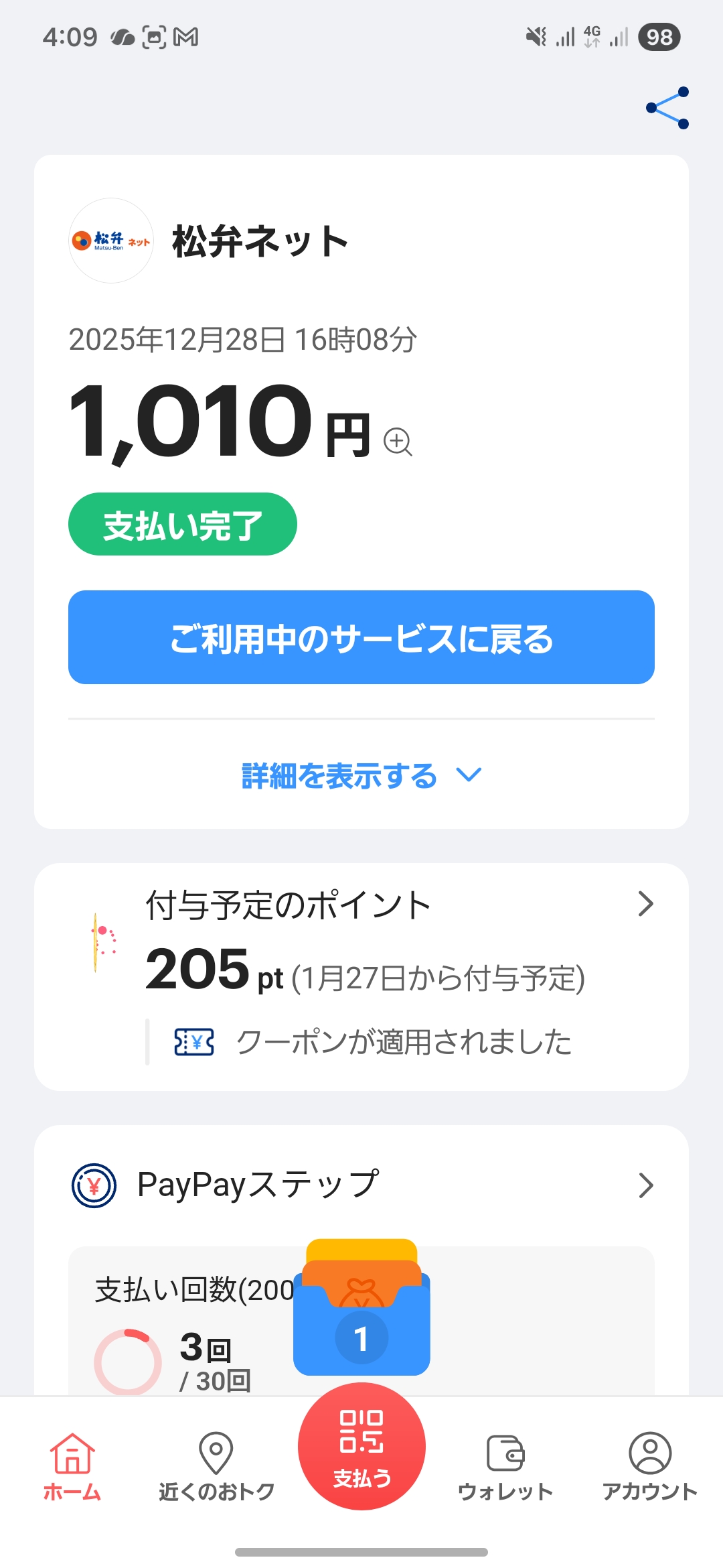 さらにこの時は、税込800円以上で20%還元されるPayPayクーポンも利用でき、PayPayポイントを205ポイント獲得。券売機は操作しづらいという理由もありますが、仮に使いやすかったとしても、クーポンやポイントを考えると券売機決済は本当にもったいないと感じます。2026年も、物価高の時代を少しでもお得に乗り切れるよう、アンテナを張っていきたいところです。