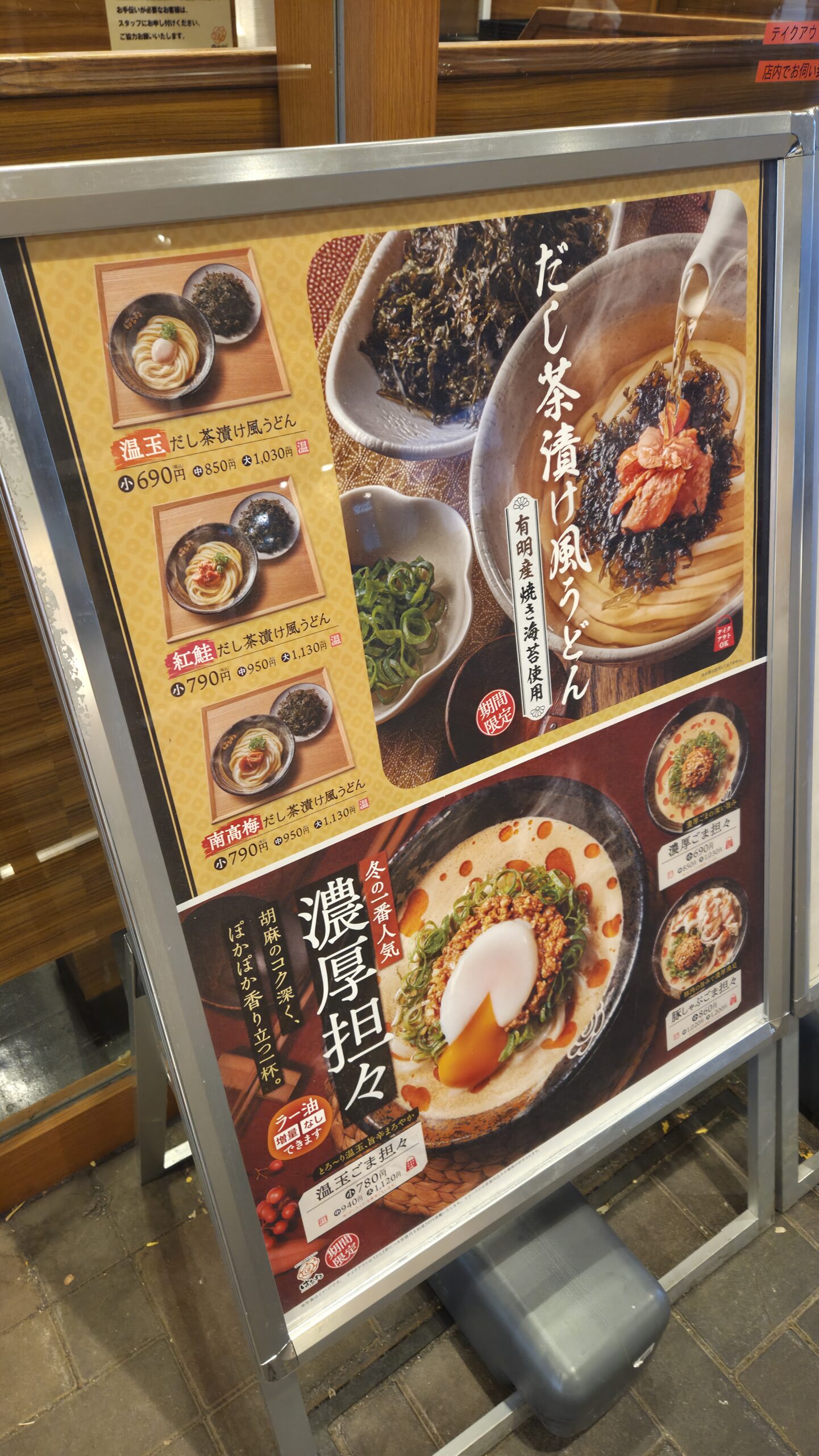 店舗に到着すると、以前食べた濃厚坦々とセットで広告されていました。濃厚坦々も販売終了前にもう一度食べに行きたいところですが、今回はもちろん「だし茶漬け風うどん」一択です。価格は、温玉が小サイズで税込690円、紅鮭と南高梅が小サイズで税込790円と、こちらは100円アップ。どれを選んでも美味しいだろうなと思い、しばらく店頭で悩みました。完全に好みの問題で、特に深い理由はないのですが、今回は紅鮭を選んでみました。