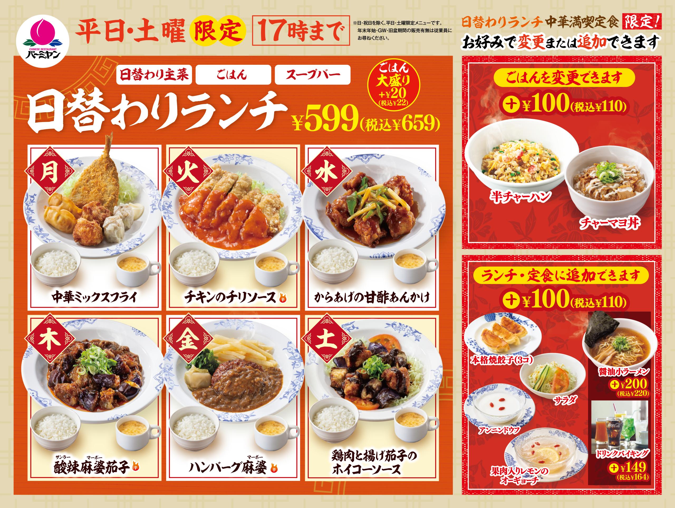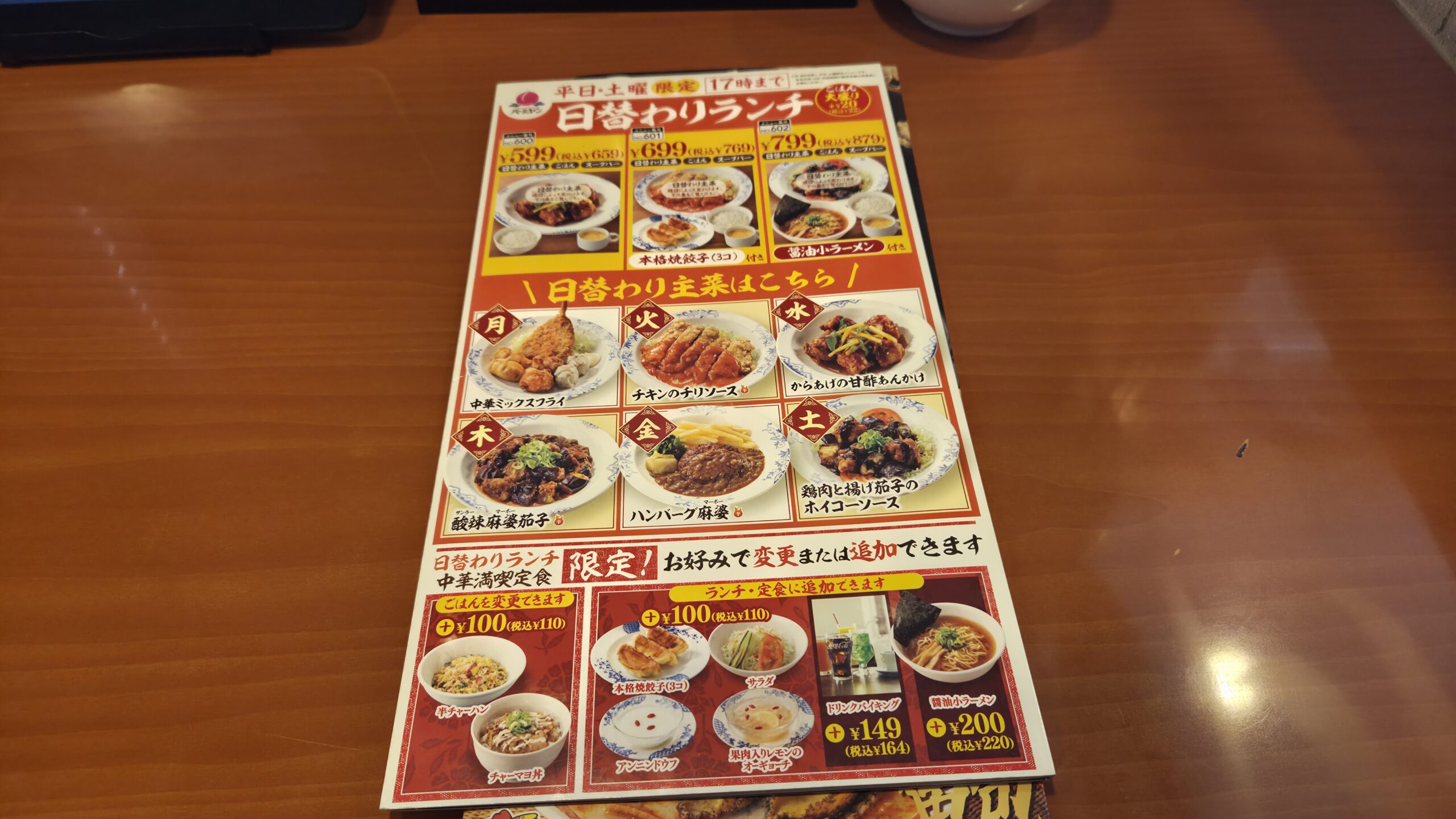 店舗に到着し、さっそくメニューをチェック。バーミヤンのランチは、標準メニューに加えて予算や好みに合わせて「ご飯の変更」や「サイドメニューの追加」が柔軟に選べるのが魅力です。