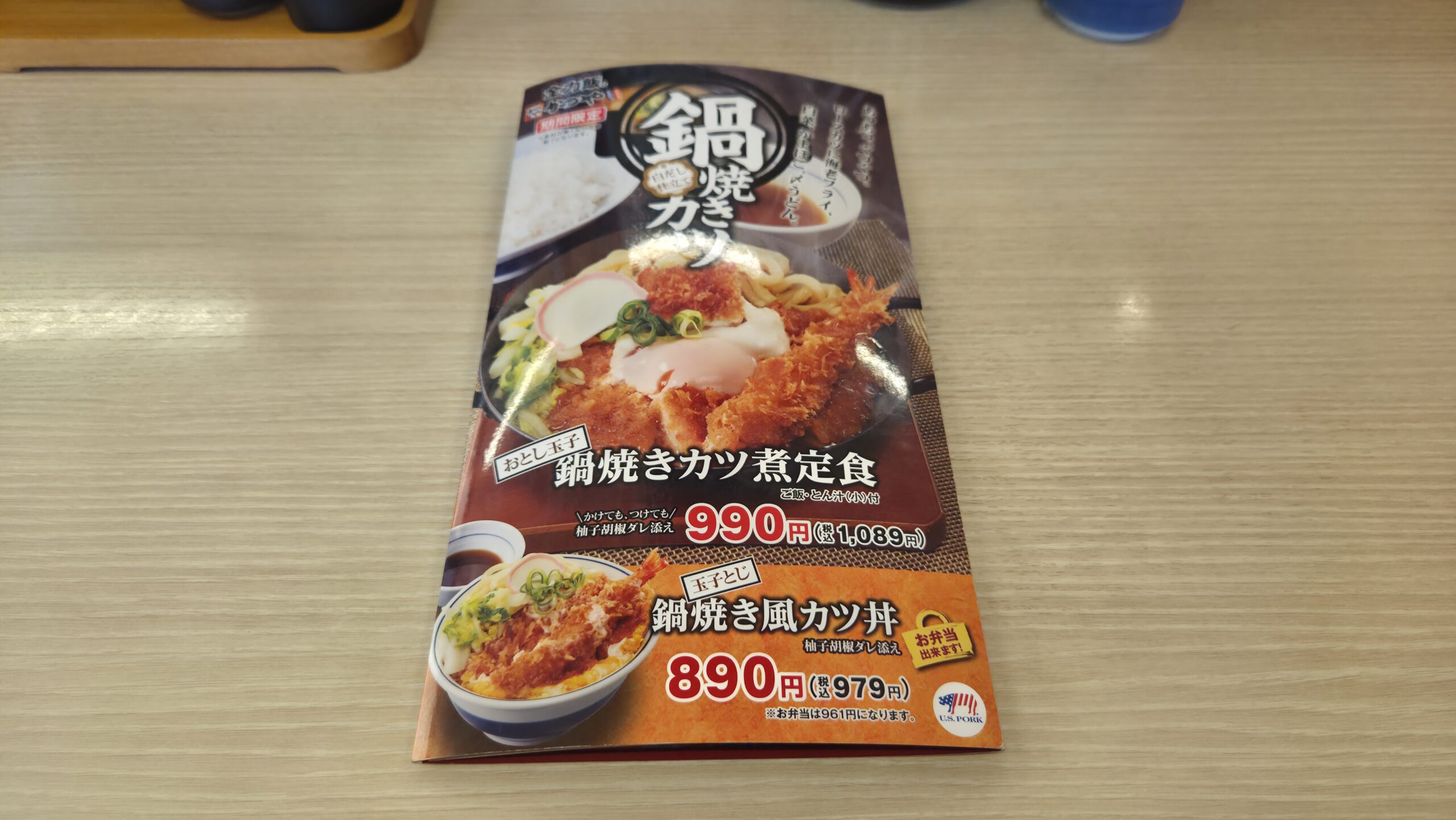少し驚いたのが、普段は「丼」がメインで大きく掲載されることが多いのですが、今回は「定食」の方が主役級の扱いでドカンと載っていたことです。うどんが入っているからでしょうか?これまでの期間限定メニューの中でも、定食がここまで推されているのは珍しい気がします。