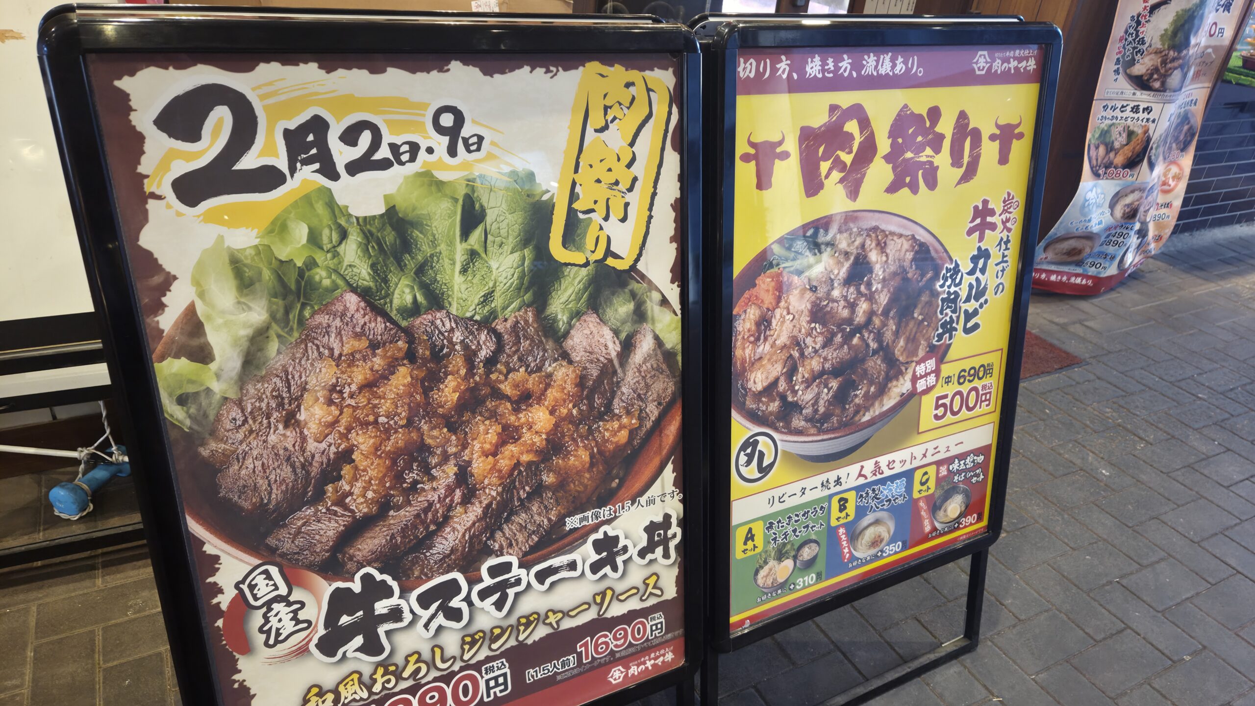 肉の日当日はメニューを絞っての提供となります。 基本的には、ワンコインの「牛カルビ焼肉丼」か、1,000円超えの「牛ステーキ丼」の二択。やはり手に取りやすいのは「牛カルビ焼肉丼」でしょう。通常価格690円のところ、190円引きの「500円(税込)」で提供されており、本当にお得です。物価高が続く昨今、他店でワンコインでこれだけの満足感を得られるメニューが他にあるかと言われると、なかなか思いつきません。席に座って迷わず注文しました。