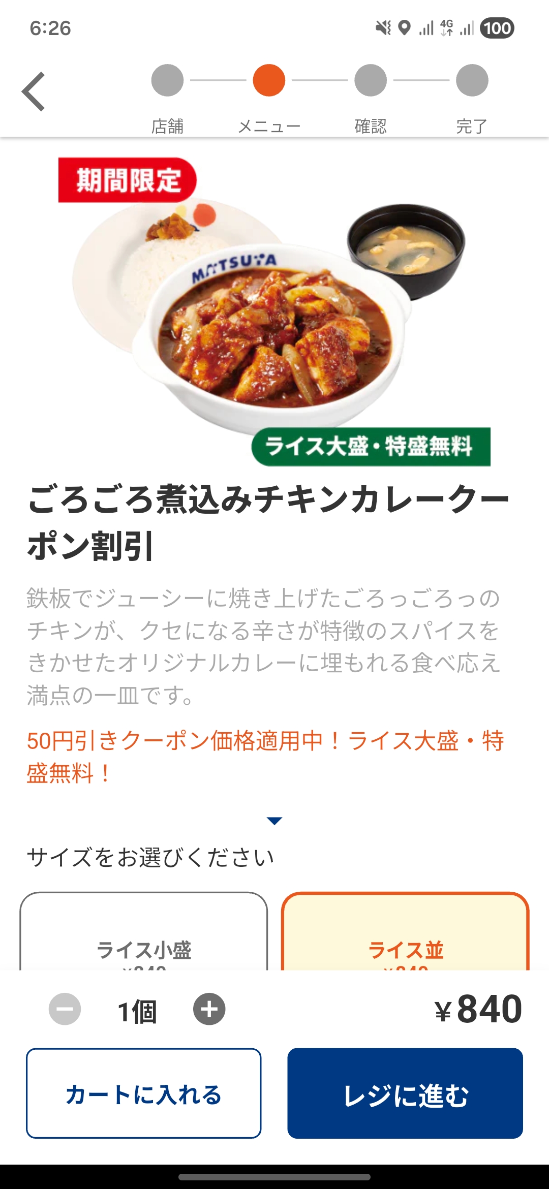 最近は外食の価格も上がっていますが、賢く立ち回りたいものです。 今回の「ごろチキ」は通常価格890円(税込)ですが、私は松屋公式アプリのクーポンをフル活用しました。