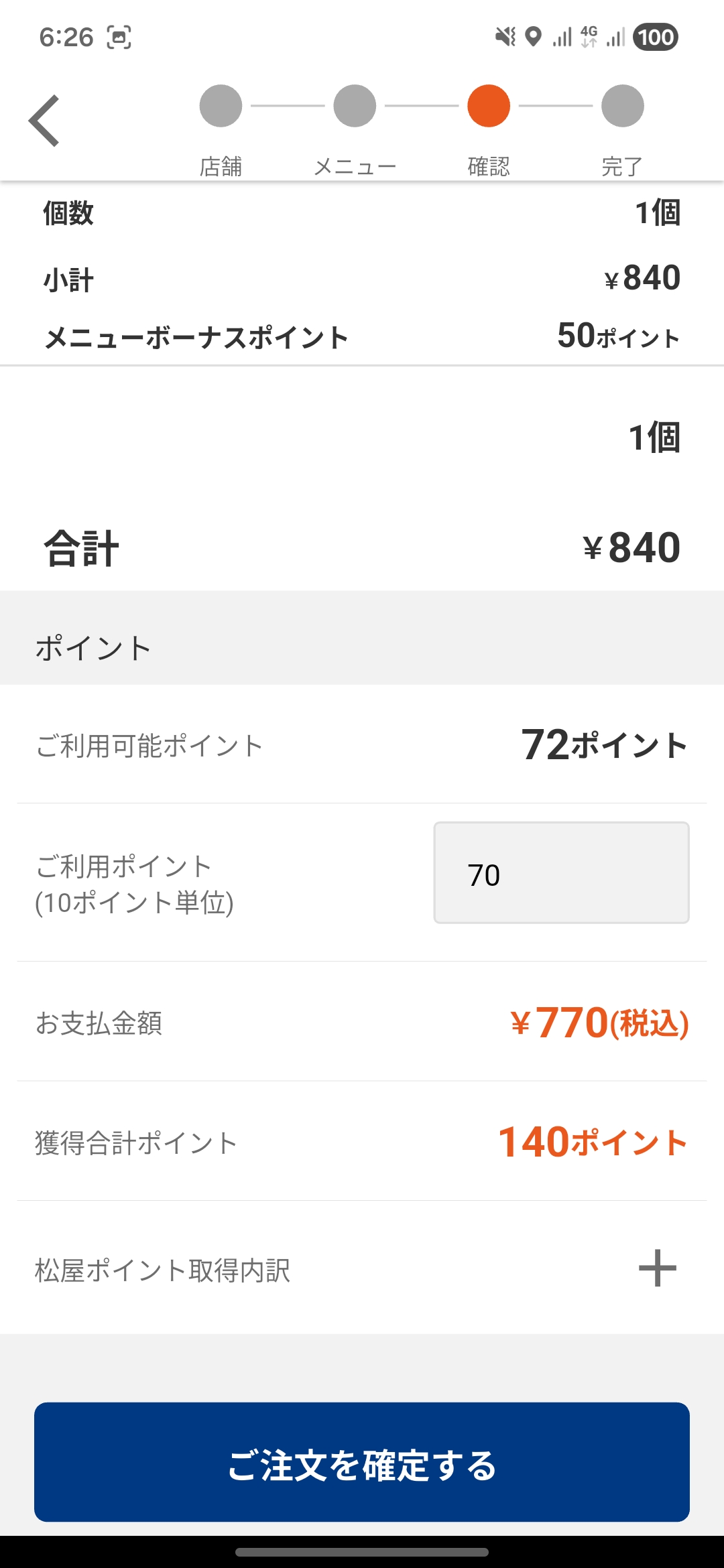 さらに、キャンペーン期間中(現在は終了)のモバイルオーダー利用キャンペーンで、なんと140ポイントも獲得できました。これだけでさらにコスパがえげつないことになります。そして嬉しいことに、今回の注文で来月のランクが「ゴールドランク」に確定! 還元率が4.0%にアップするので、来月の食レポもさらにお得に楽しめそうです。