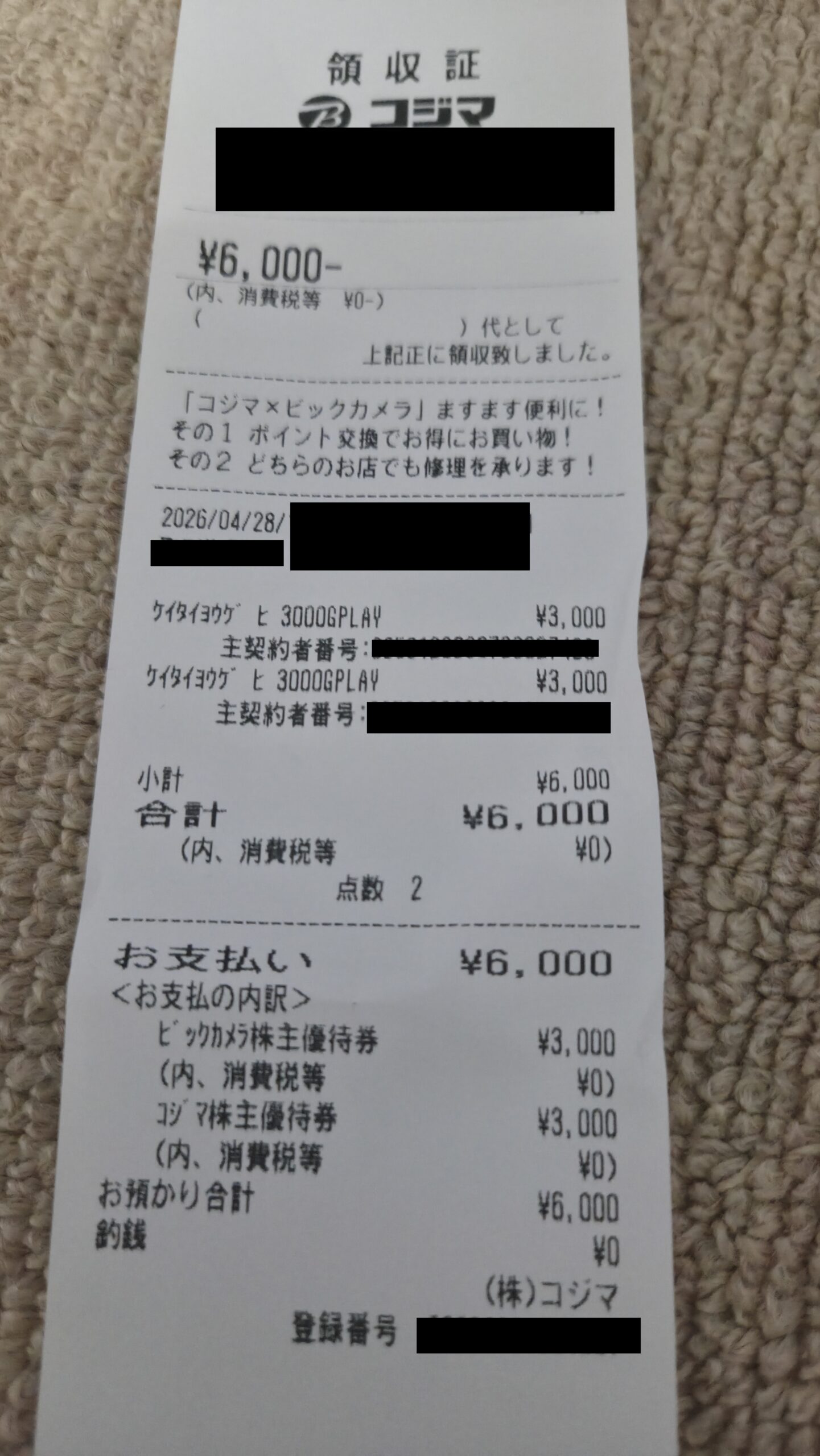 実際にコジマの店頭で、ビックカメラとコジマの株主優待券を併用してGoogle Play ギフトカードを購入してきました。