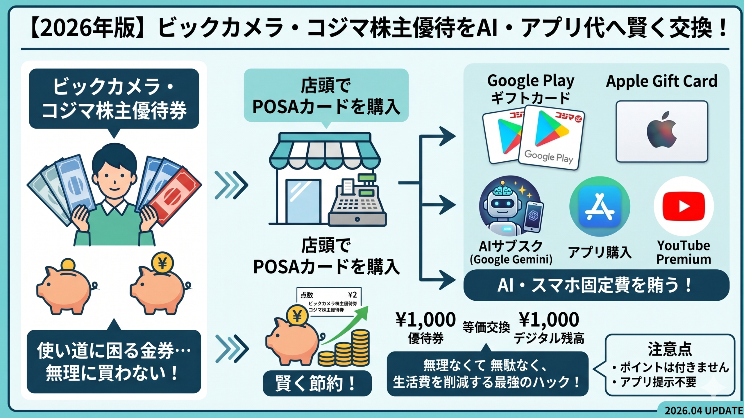 優待券をGoogle PlayやAppleの残高に変えておくことで、AIの利用料やスマホアプリ代を賢く節約できます。2026年も、この「優待→デジタル残高変換」ルートは最強の節約術の一つです!