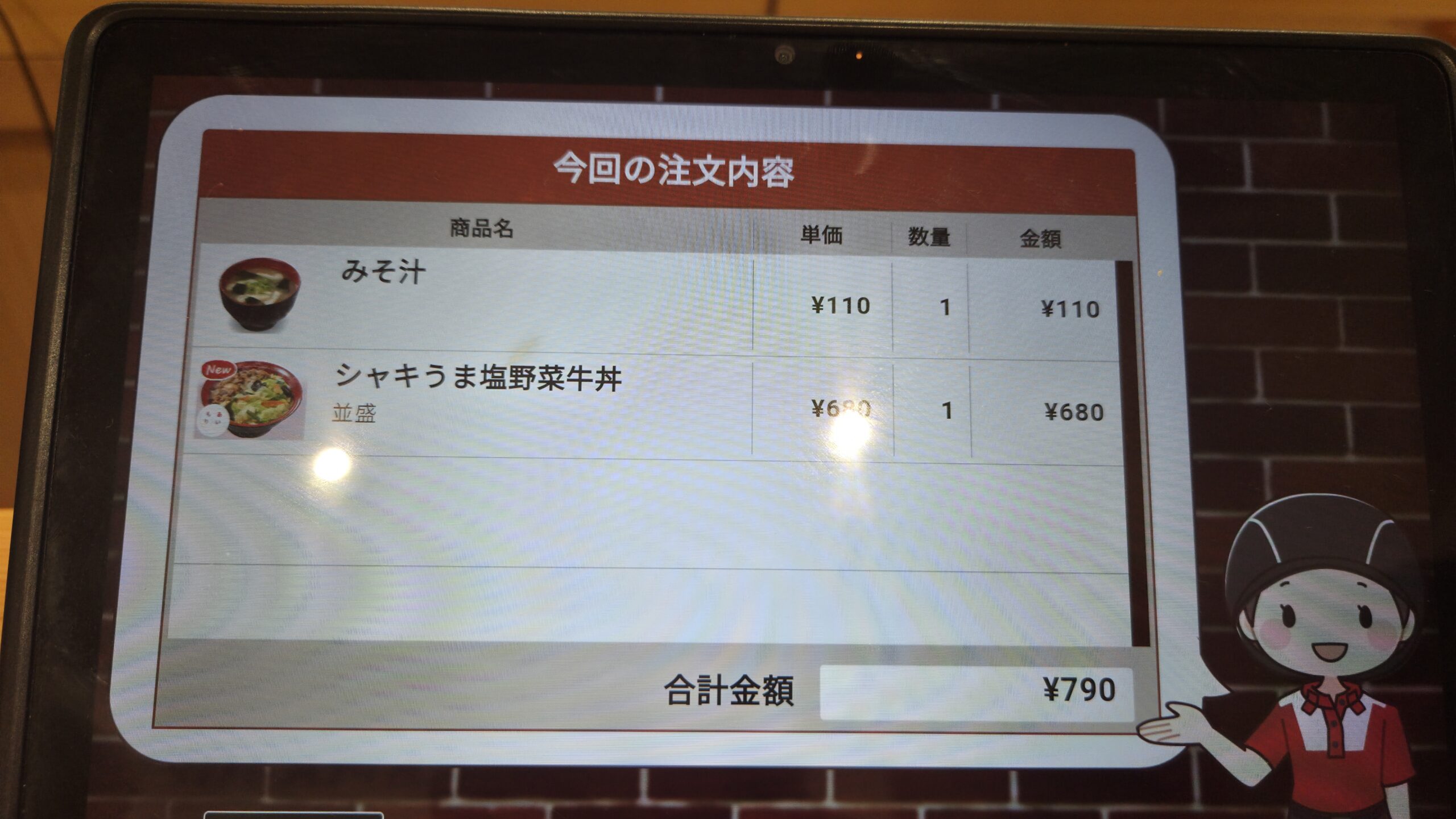 今回注文したのは、お目当てのシャキうま塩野菜牛丼(並盛)。お値段は税込680円です。 タブレットで注文する際、サイドメニューにお味噌汁(税込110円)も追加しました。