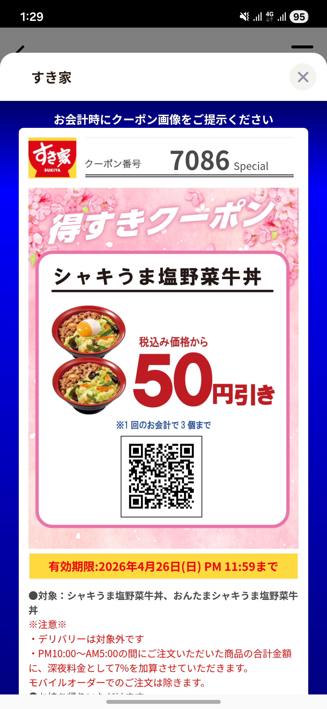 行った時にはすき家公式アプリでは50円割引クーポンが配信されていました。会計時に提示してお得に食べることが出来ました。お会計前に公式アプリも要チェックです。