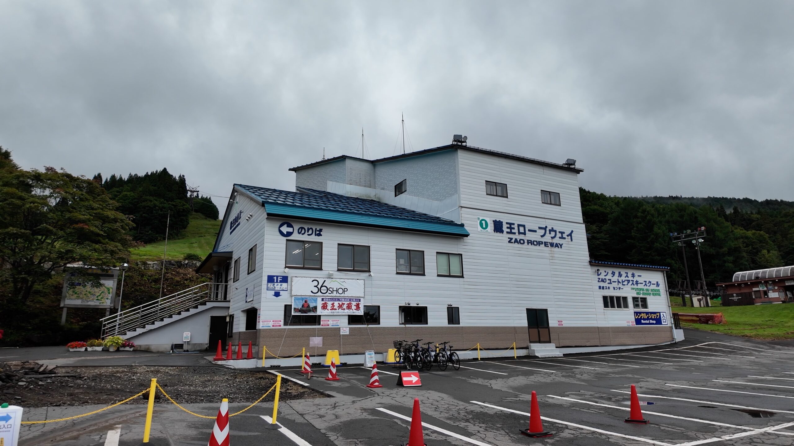 利用してみたかった、蔵王ロープウェイの山麓駅にやって来ました。上を見ても何も見えない状態で大丈夫なのかなという感じです。