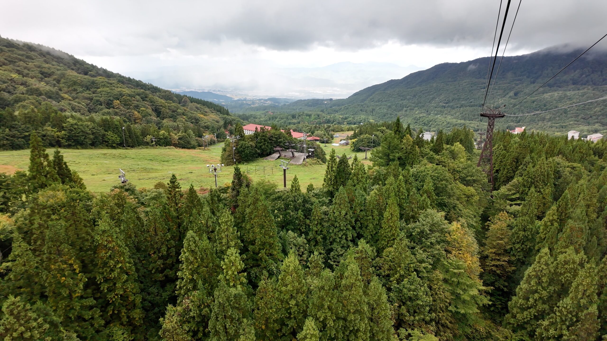 ロープウェイの横はスキー場になっていました。冬になると大勢の人が来るんでしょうね。そして霞んでいますが遠くには街並みが見えるようになりました。どうやらかみのやま温泉周辺のようです。