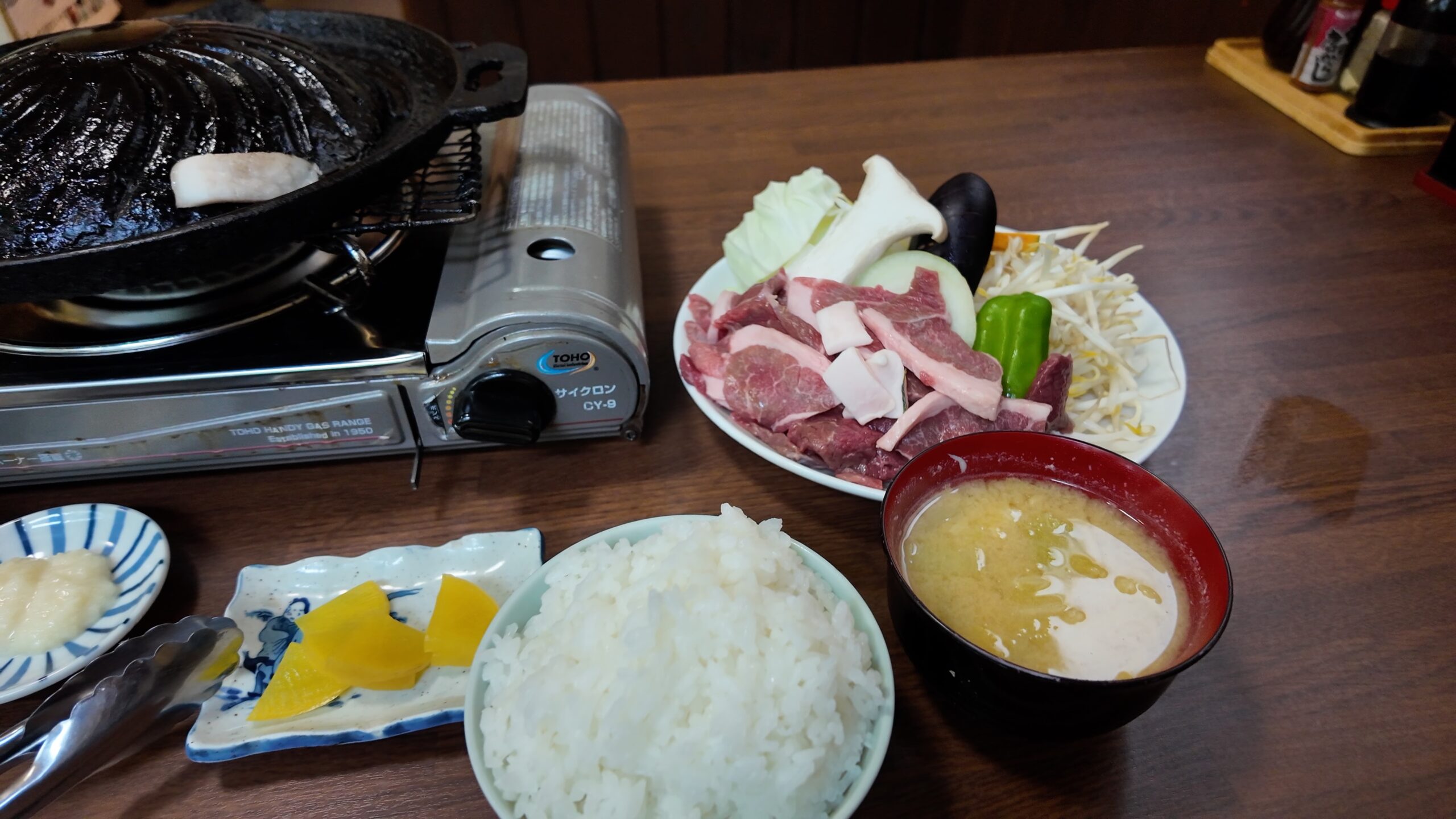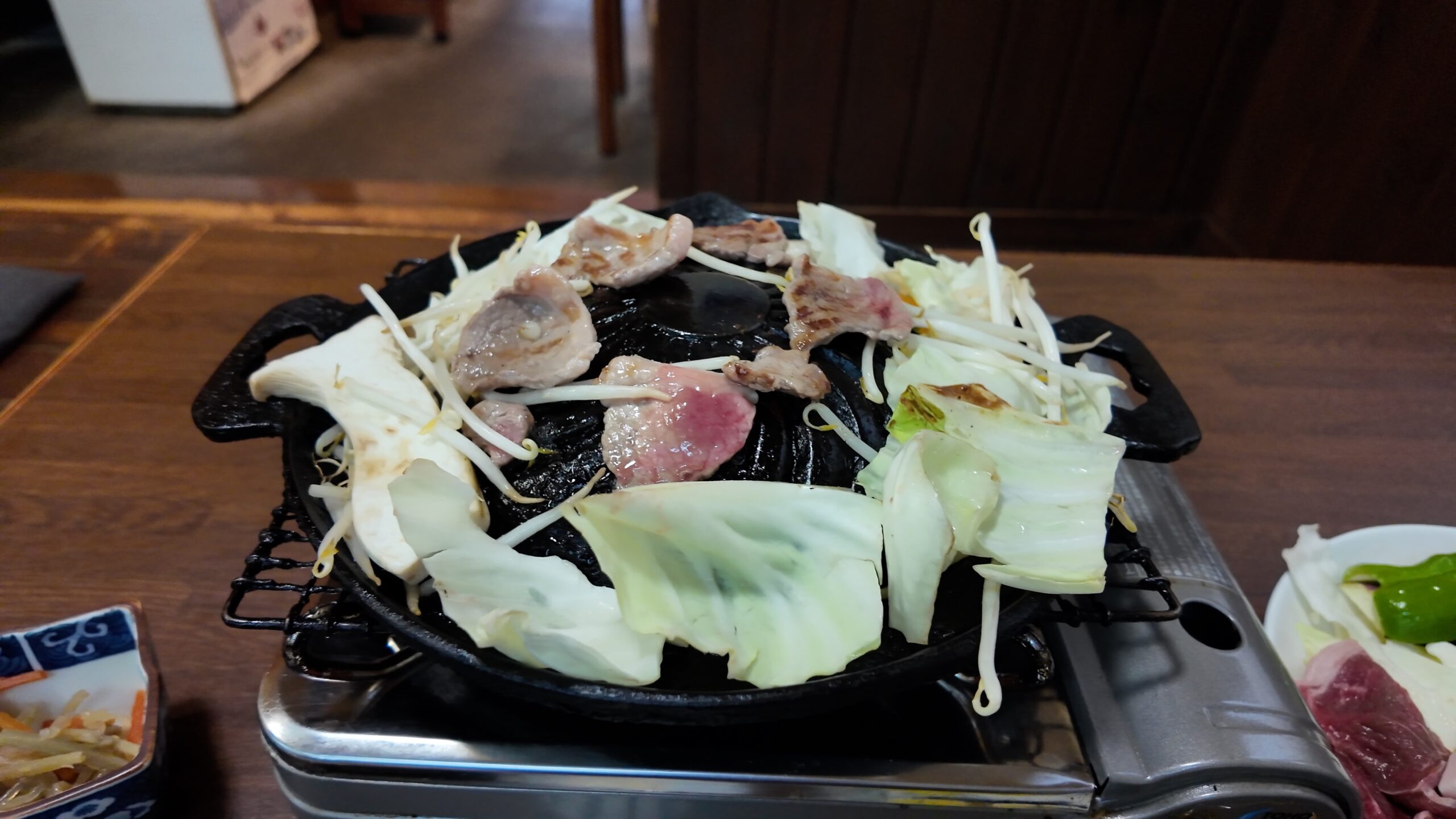 ジンギスカン定食を注文して出て来たのがこちらです。なんでも蔵王温泉がジンギスカン発祥の地とされているようでして、この辺りの名物との事です。北海道が有名ですが蔵王温泉で意外な感じでしたが、そのお話をお店の方にお伺いして注文した次第です。