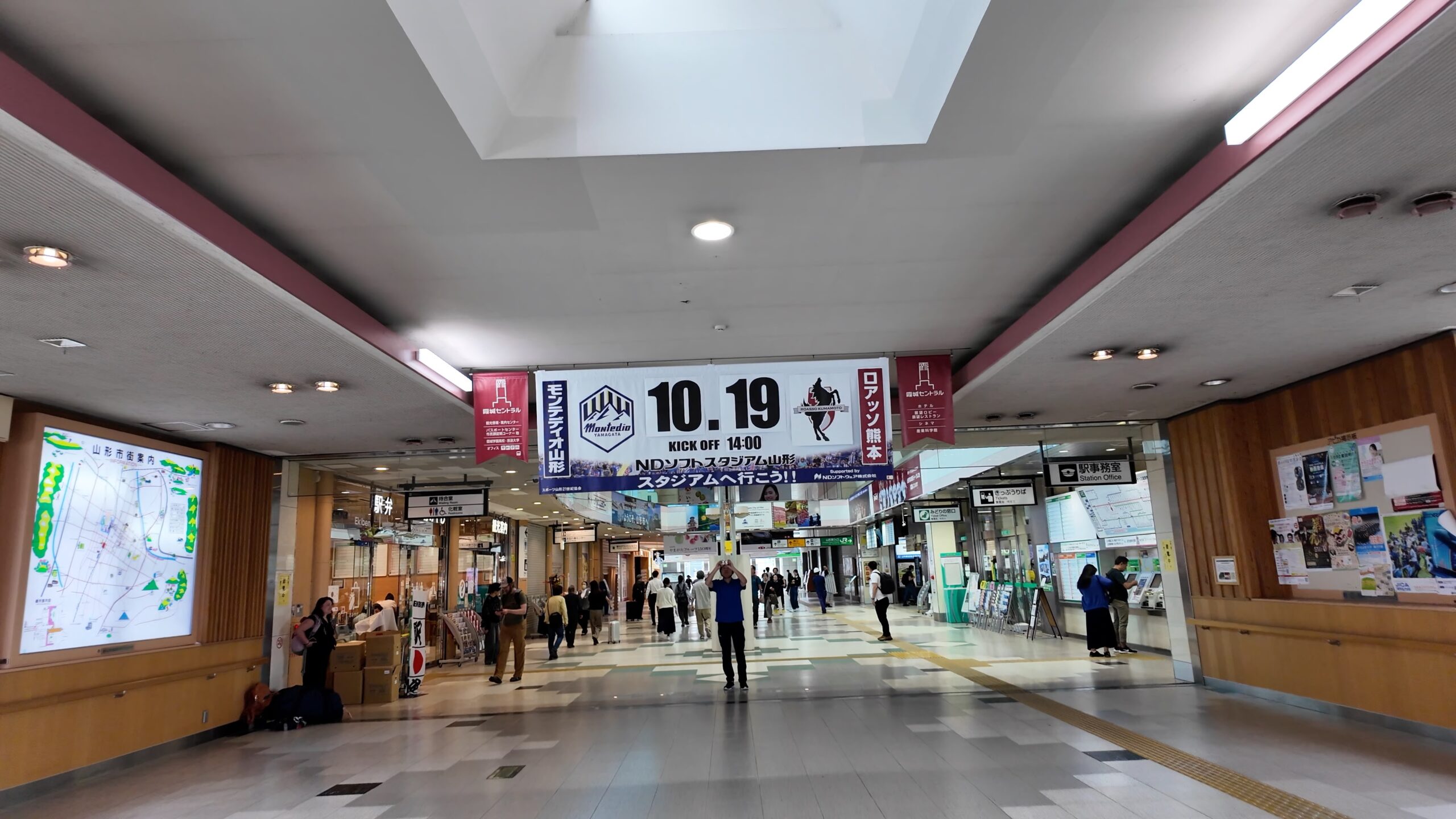 バスの時間に合わせてホテルをチェックアウトしました。バスが出発する山形駅東口まで連絡通路を使って向かいます。途中ではサッカーの広告を見ました。地方にどんどんサッカーが根付いて欲しいですが、寒さが厳しくなる時期はどうなのかだけが気になります。