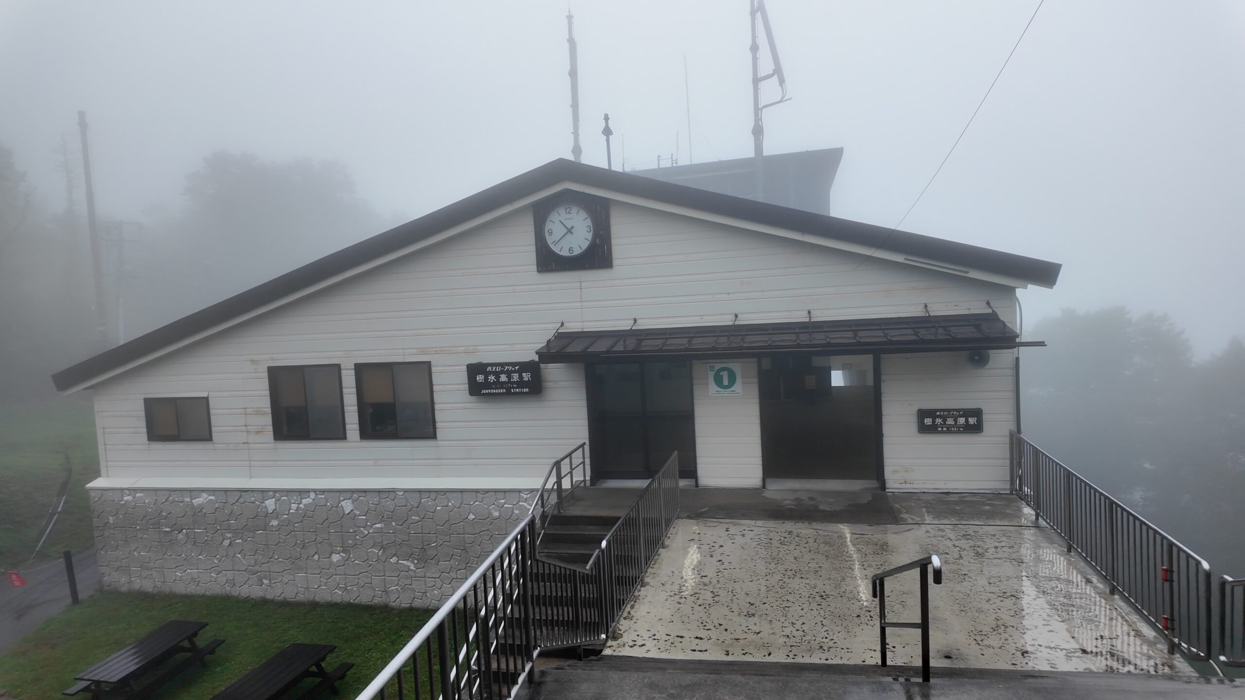 そして樹氷高原駅に到着したのですが、何も見えずに観光どころではない感じでした。これならこの先の山頂線が運休になってしまうのも仕方がありません。この辺りの標高は1300メートルを超えていて、山麓駅付近とは全然様子が異なっていました。